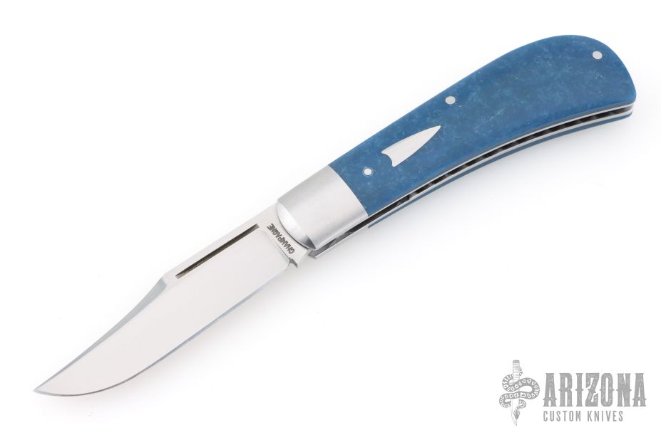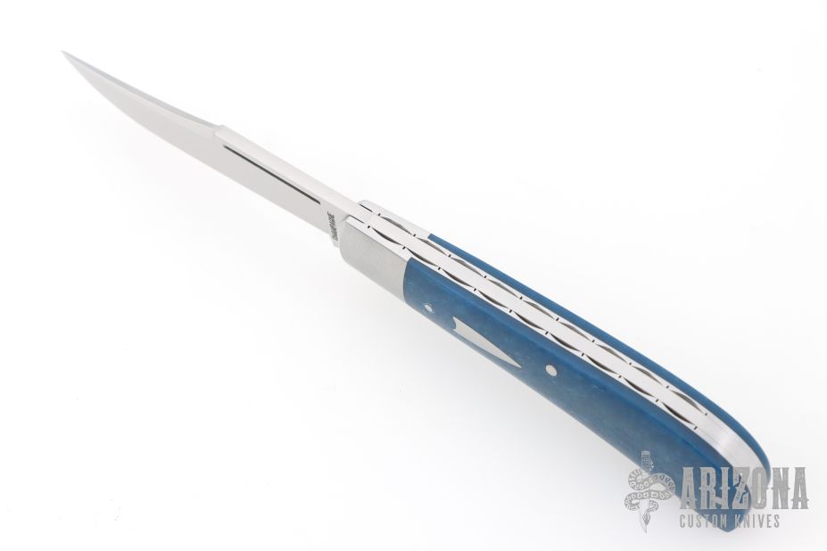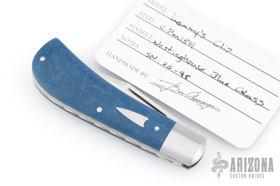 This Lanny's Clip by Ben Champagne features a hand rub satin finished blade with nail nick. The handle has stainless steel bolsters, Westinghouse Blue Glass covers, fileworked stainless steel liners with jeweled interiors, stainless steel spring. Has half-stop, flush in all positions. Comes with a zippered case and COA dated 2026 and #98. New from maker at the 2026 Blade Show Texas.