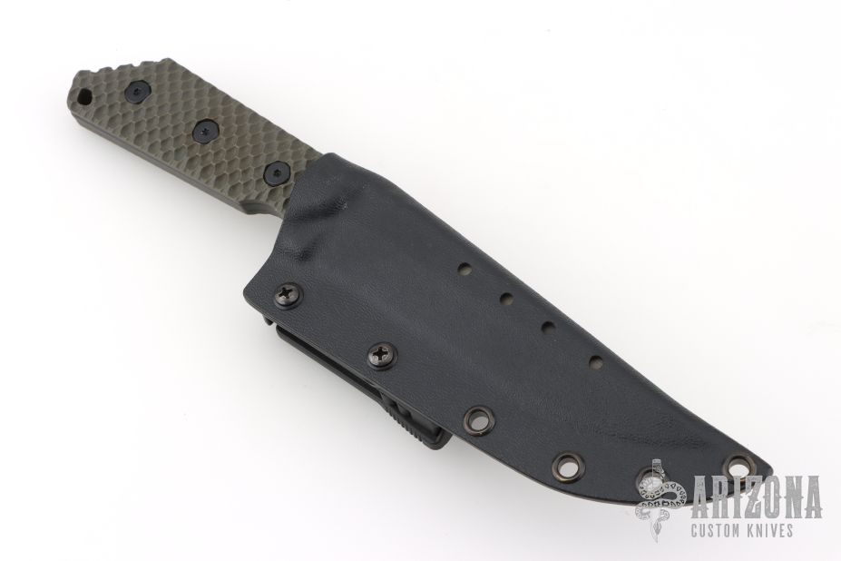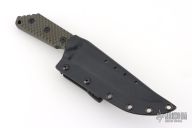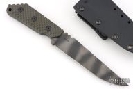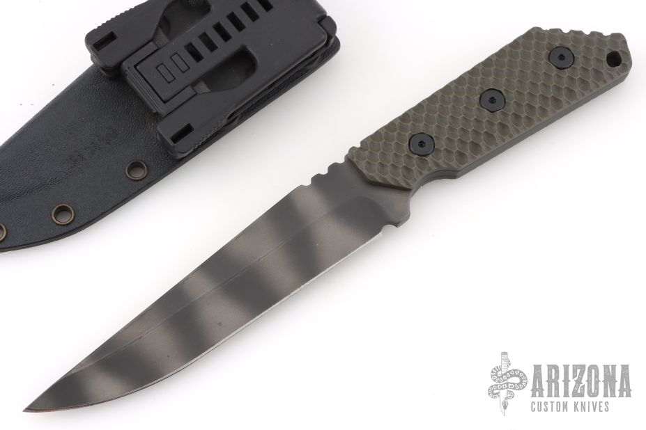 This MK1C by Strider Knives features a tiger stripe finished blade with notched thumbrest, .189" blade stock and 1.253" blade depth, full tang construction with green Gunner Grip G-10 scales. Comes with a kydex sheath with TekLok. Excellent condition.
