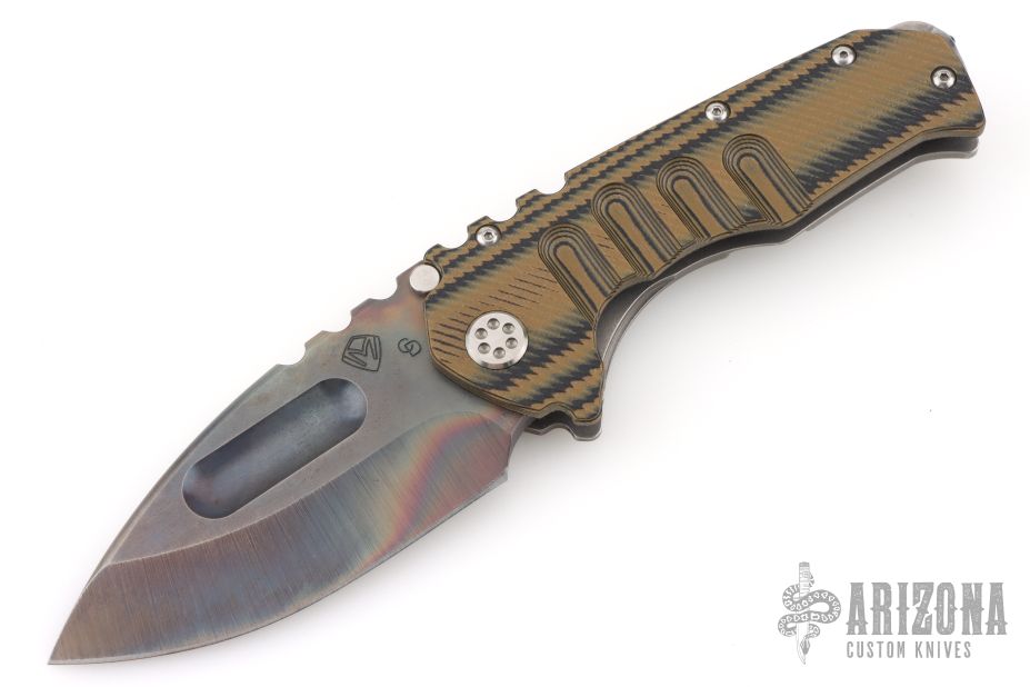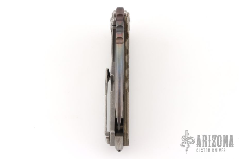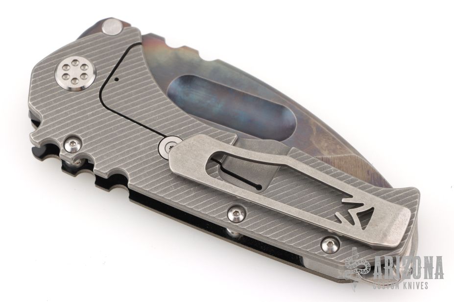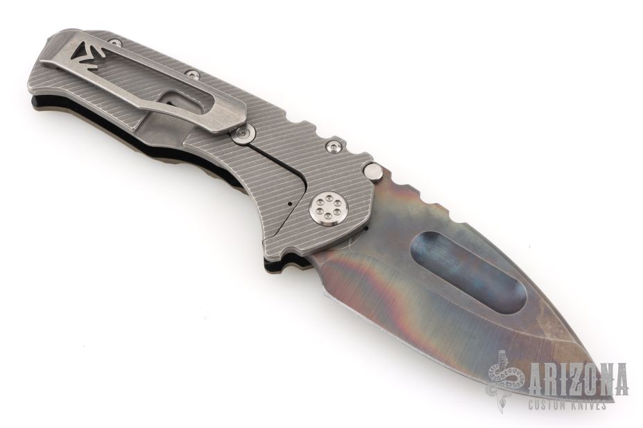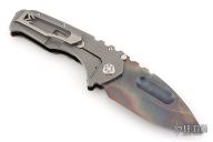 This Praetorian Ti-C by Medford Knife and Tool features a vulcan finished drop point blade with fullers and notched thumbrest. The handle has a contoured black/tan G-10 and contoured titanium frame over a steel backspacer with ceramic ball glass breaker and lanyard hole. The tumbled titanium pocket clip is positioned for right hand, tip up carry. 511-014 inside the frame. Includes original box, zippered case and COA dated Feb 11, 2026. Excellent condition.