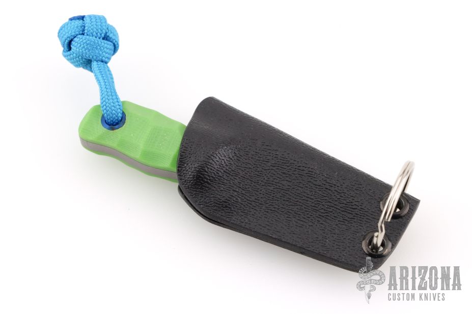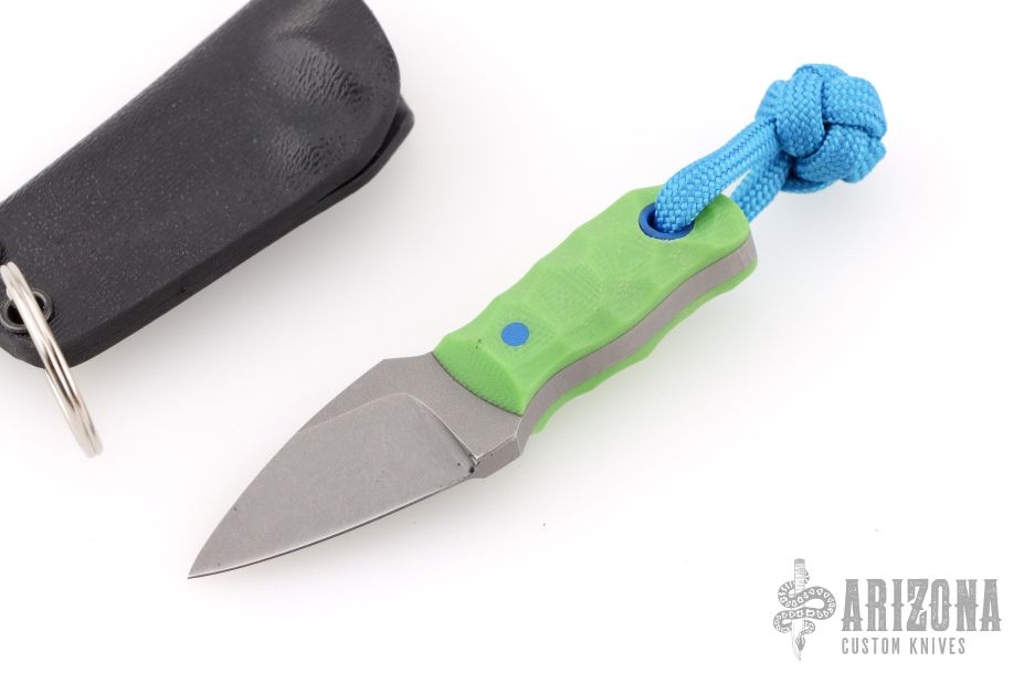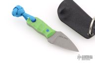 This Pocket Lint by Auxiliary Manufacturing features an acid-tumbled drop point blade with .167" blade stock and .775" blade depth. The handle has green G10 scales. Comes with original box, and a kydex sheath with split ring. New from maker!