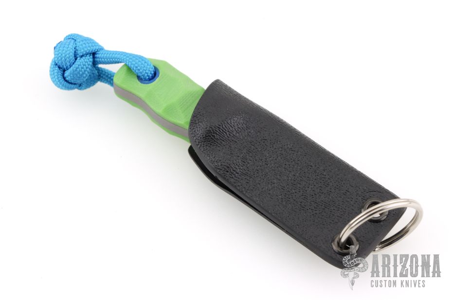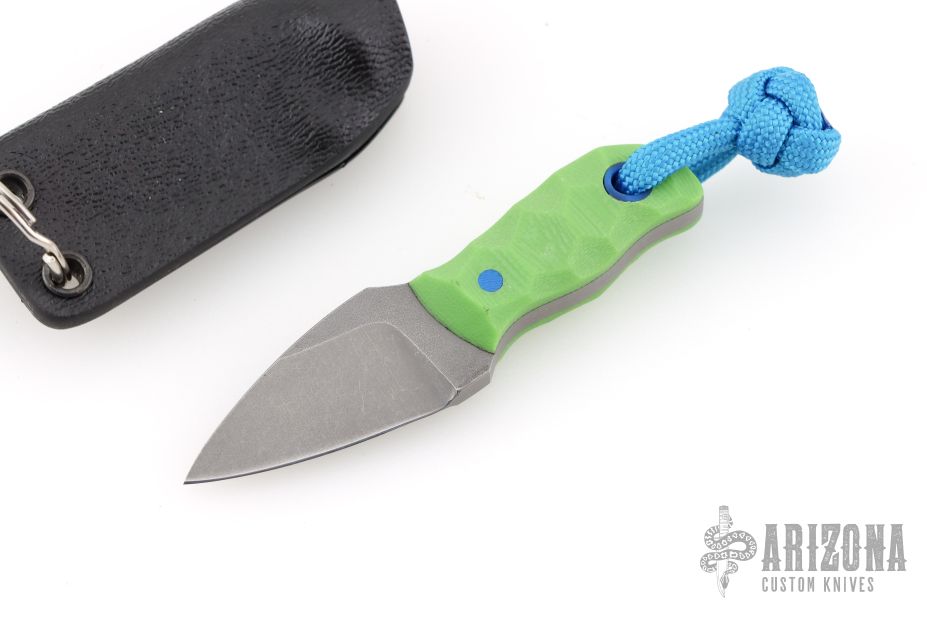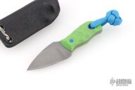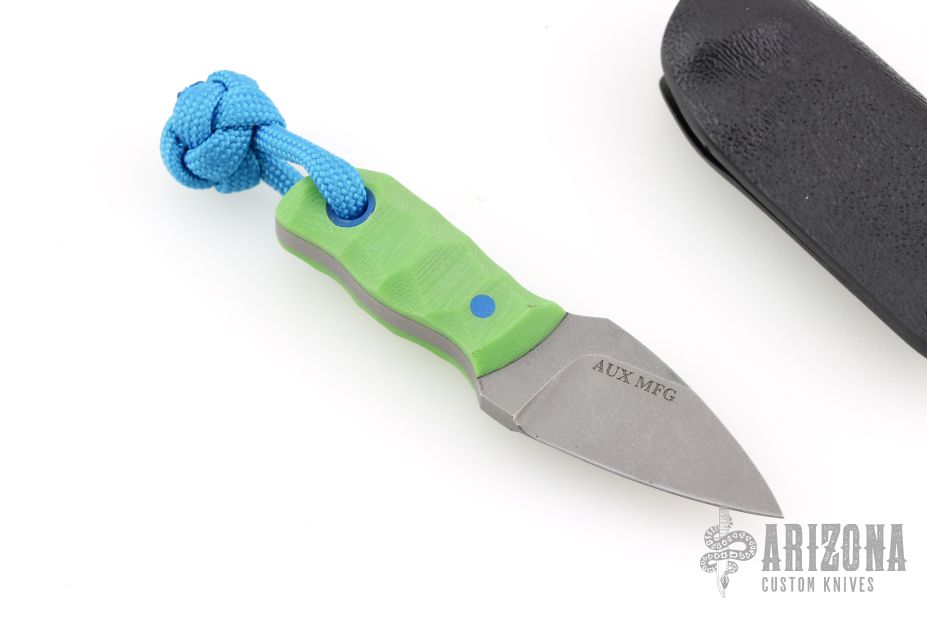 This Pocket Lint by Auxiliary Manufacturing features an acid-tumbled drop point blade with .167" blade stock and .775" blade depth. The handle has green G10 scales. Comes with original box, and a kydex sheath with split ring. New from maker!