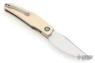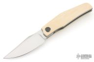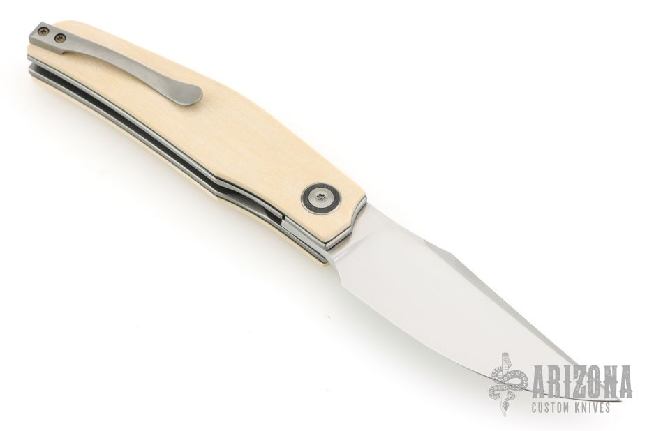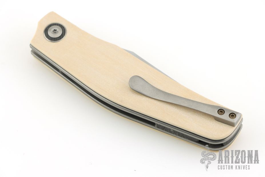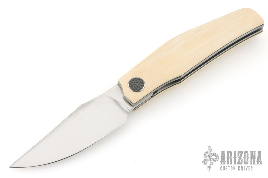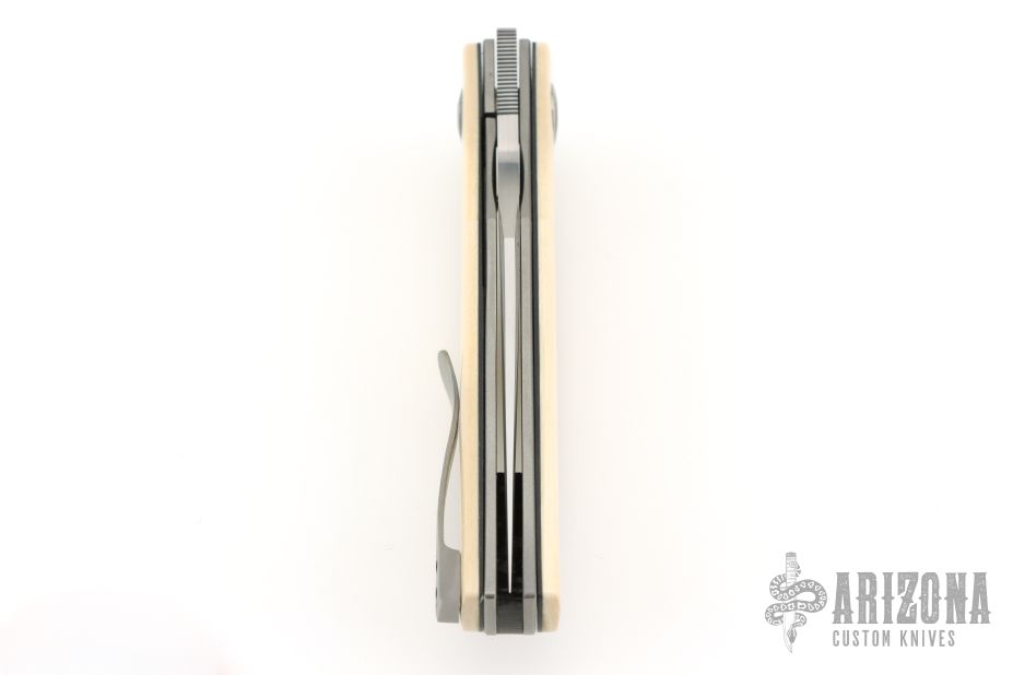 This Linerlock Front flipper by Thierry Savidan features a hand rub satin finished blade with false top edge and a front flipper. The handle has mammoth ivory scales with black liners, carbon fiber cabochon pivot, tip up titanium clip, fat carbon backspacer with lanyard pin, blasted titanium liners. Nice detent, lockup and blade seating. Comes with zippered case and COA dated 3/2026. New from maker at the 2026 Blade Show Texas.