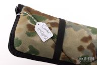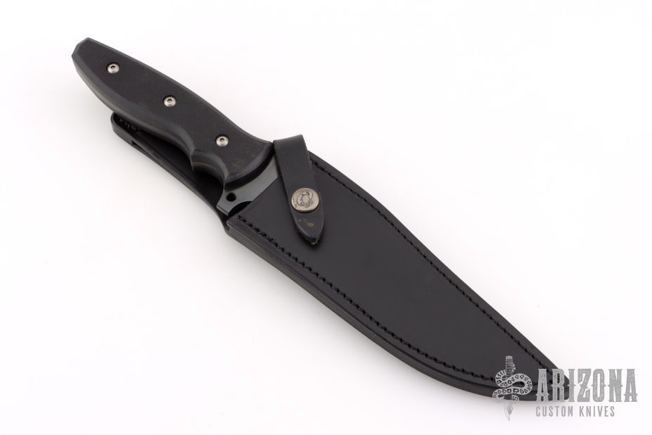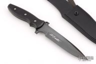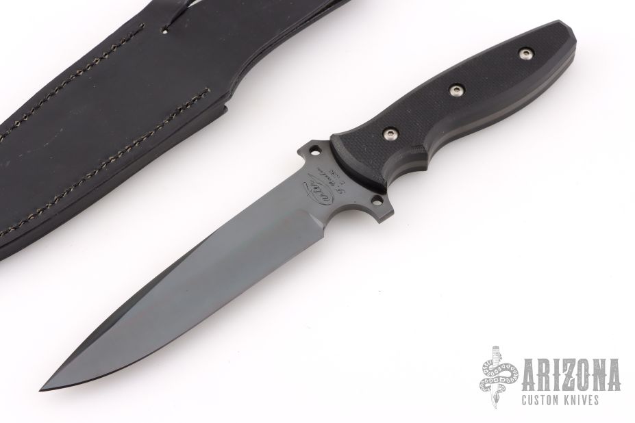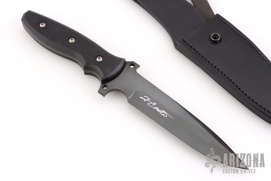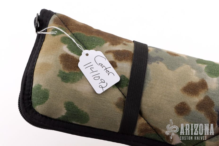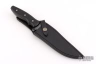 This C-1080 Fighter by Fred Carter features a blued and satin finished clip point blade with false top edge, full tang construction with .178" blade stock and 1.263" blade depth. The handle has textured black G-10 scales, and a skeletonized tang to reduce wieght. Comes with a black leather sheath. Has a couple very light scratches, otherwise excellent condition. The blade has been signed "F Carter". Comes with a zippered case.