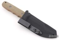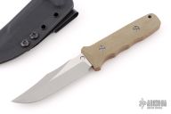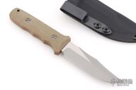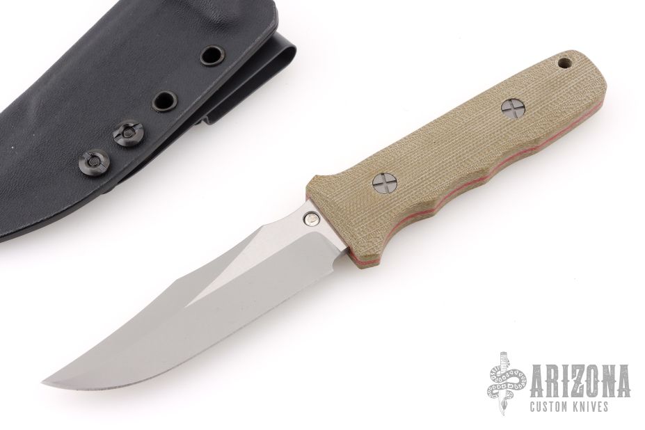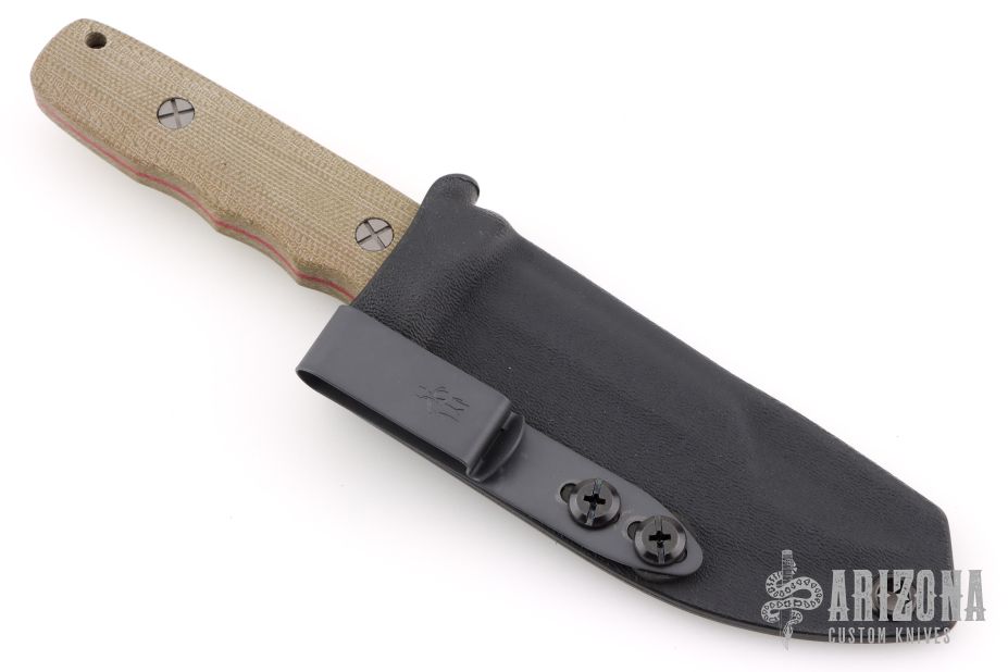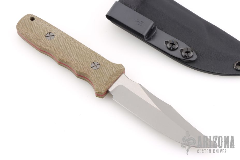 This Mini SOG Bowie by Allen Elishewitz features a two-tone matte/satin finished blade with false top edge, .164" blade stock and .999" blade depth, hidden tang construction. The handle has OD green canvas micarta grip with red canvas micarta stripe, lanyard hole at the butt. Comes with a Kydex sheath with clip. New from maker at the 2026 Blade Show Texas.