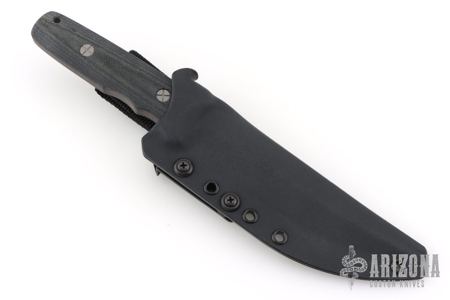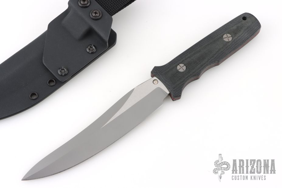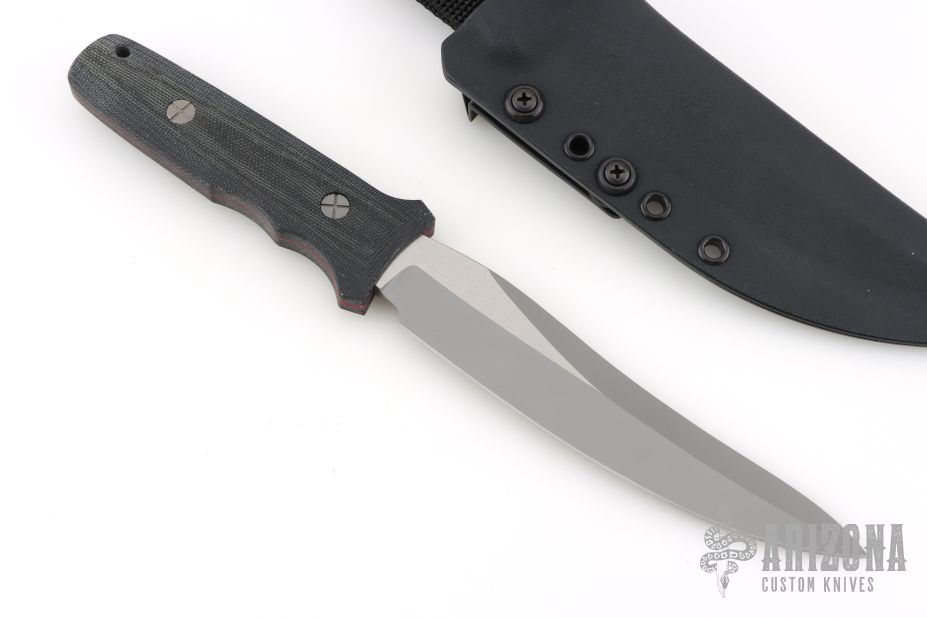 This Recon by Allen Elishewitz features a two-tone matte/satin finished blade with false top edge, .221" blade stock and 1.275" blade depth, hidden tang construction. The handle has black canvas micarta grip with red canvas micarta stripe, lanyard hole at the butt. Comes with a Kydex sheath with belt loop. New from maker at the 2026 Blade Show Texas.