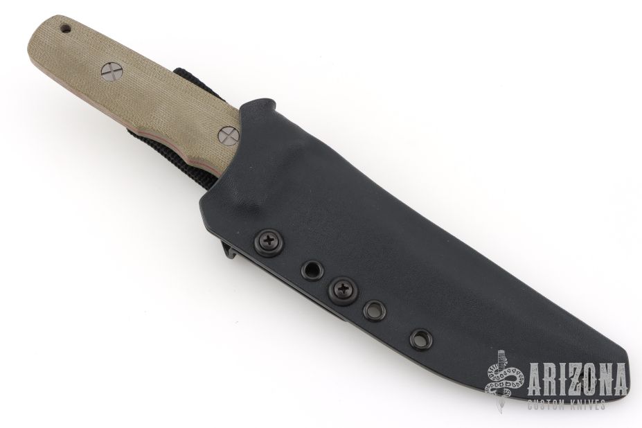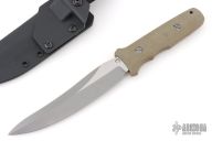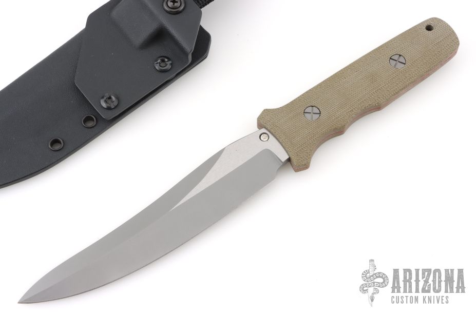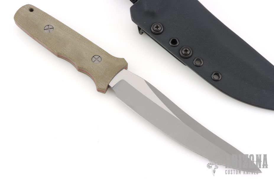 This Recon by Allen Elishewitz features a two-tone matte/satin finished blade with false top edge, .223" blade stock and 1.273" blade depth, hidden tang construction. The handle has OD Green canvas micarta grip with red canvas micarta stripe, lanyard hole at the butt. Comes with a Kydex sheath with belt loop. New from maker at the 2026 Blade Show Texas.