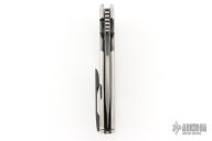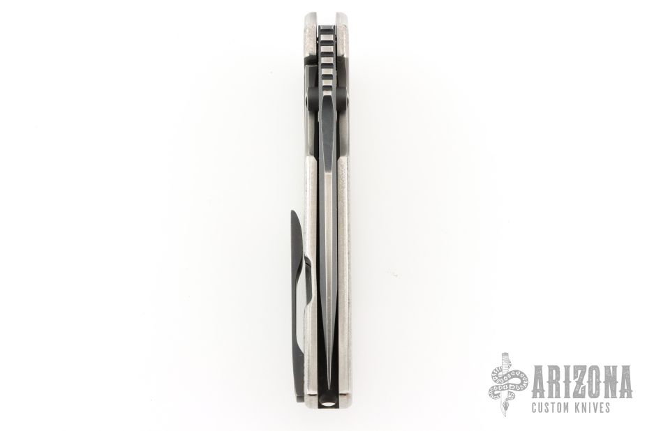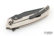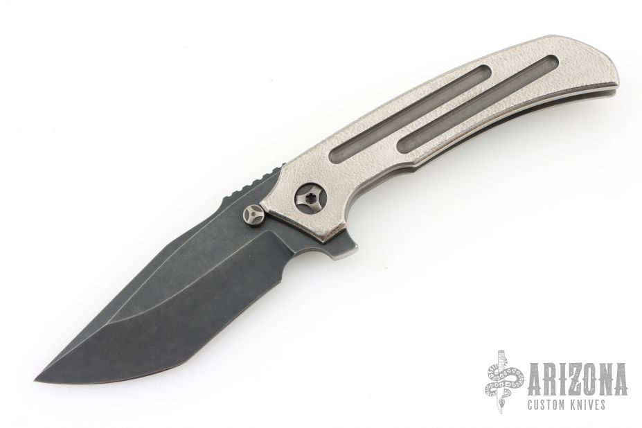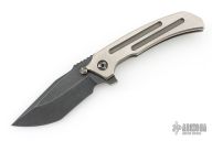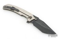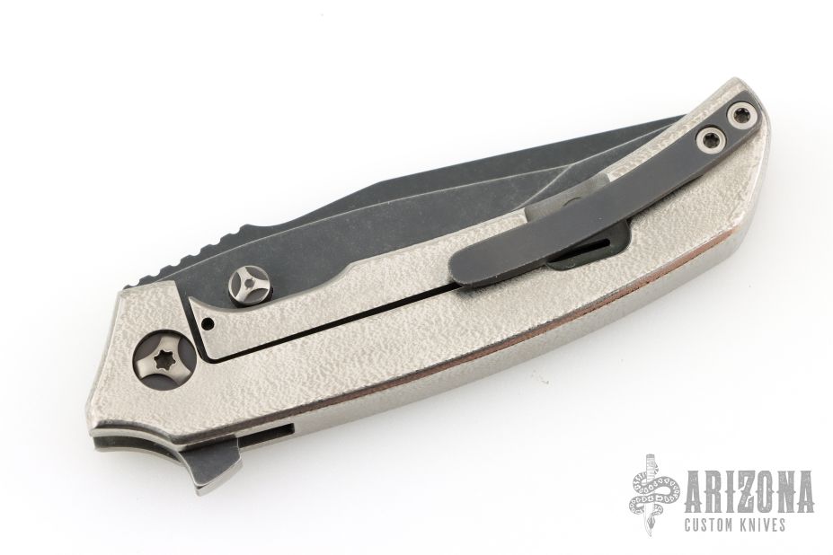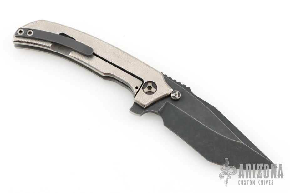 This Satori Integral by Peter Rassenti features a recurved, clip point black tumble finished blade with notched thumbrest, dual thumb studs and flipper. The handle has an orange peel finished integral titanium frame with a lanyard hole in pommel, and a tip up black tumbled titanium clip. Rides on bearings, nice detent, lockup and blade seating. Comes with a zippered case. Excellent condition.