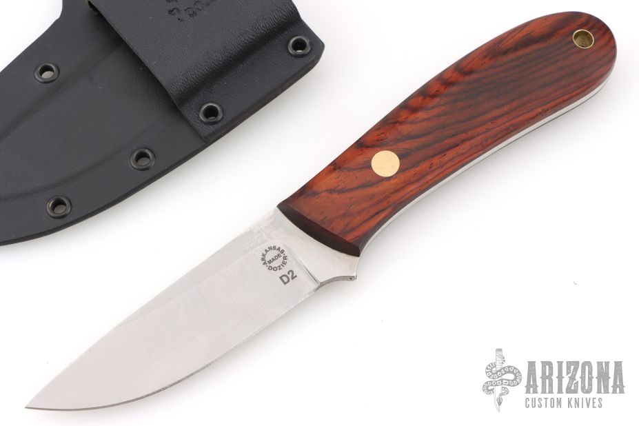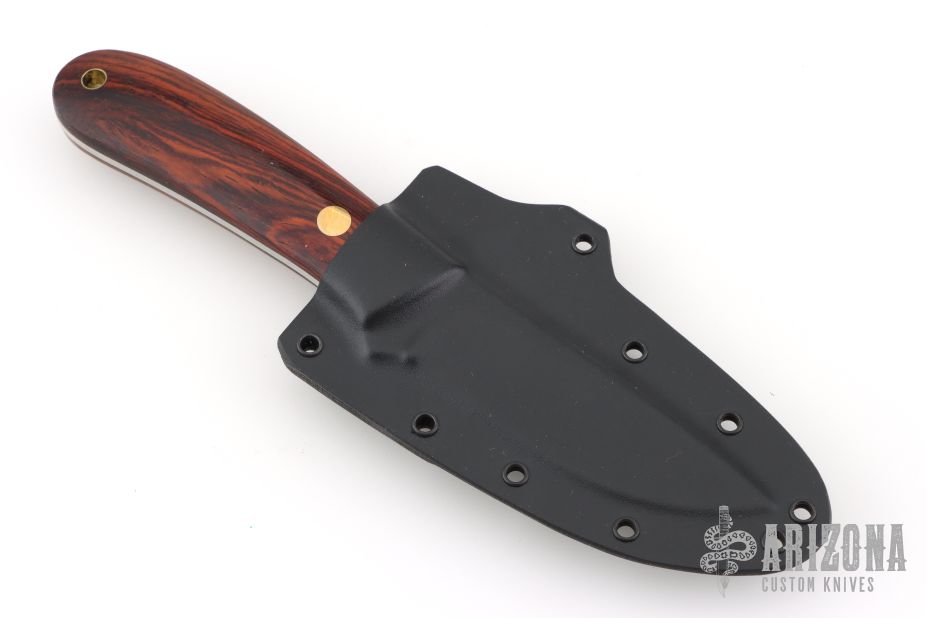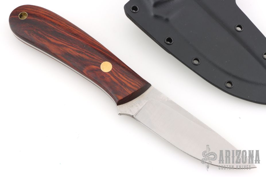 This K-16 Yukon Pro Skinner by Dozier Knives features a satin finished blade with .132" blade stock and 1.034" blade depth, full tang construction. The handle has cocobolo scales with brass pins and lanyard hole. Comes with kydex sheath with belt clip. New from maker.