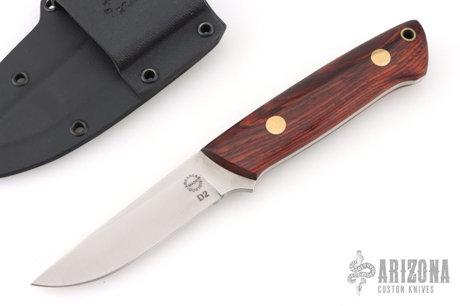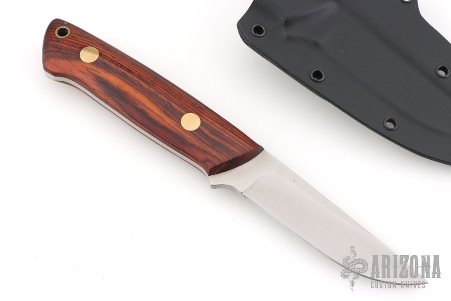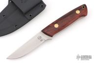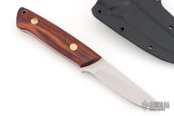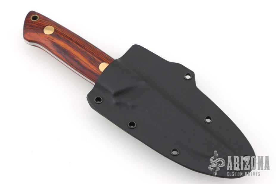 This K-7 Slim Outdoorsman by Dozier Knives features a satin finished blade with .132" blade stock and .844" blade depth, full tang construction. The handle has cocobolo scales with brass pins and lanyard hole. Comes with kydex sheath with belt clip. New from maker.