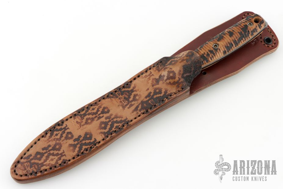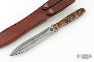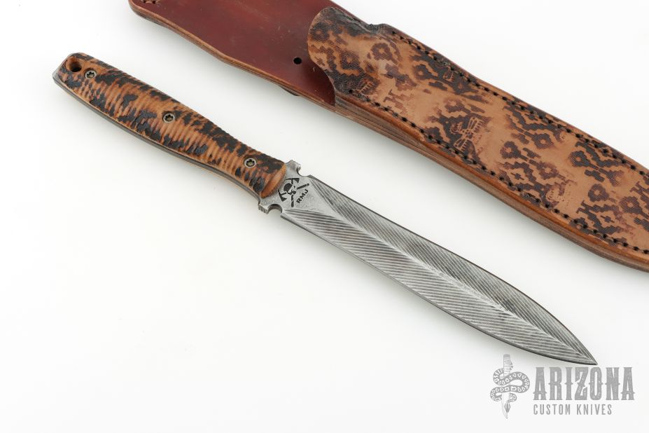 This Dagger by Ryan Johnson of Gold Point Forge and RMJ Tactical features milled bevels, .184" blade stock and 1.054" blade depth, full tang construction. The handle has fire branded hickory scales with anodized screws, notches on tang of blade and edges of the guard. This knife has the RMJ and GPF logo in the ricasso. Comes with branded leather sheath. New from maker!