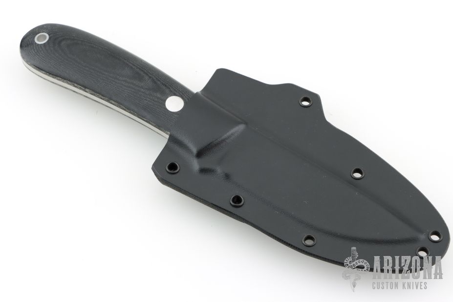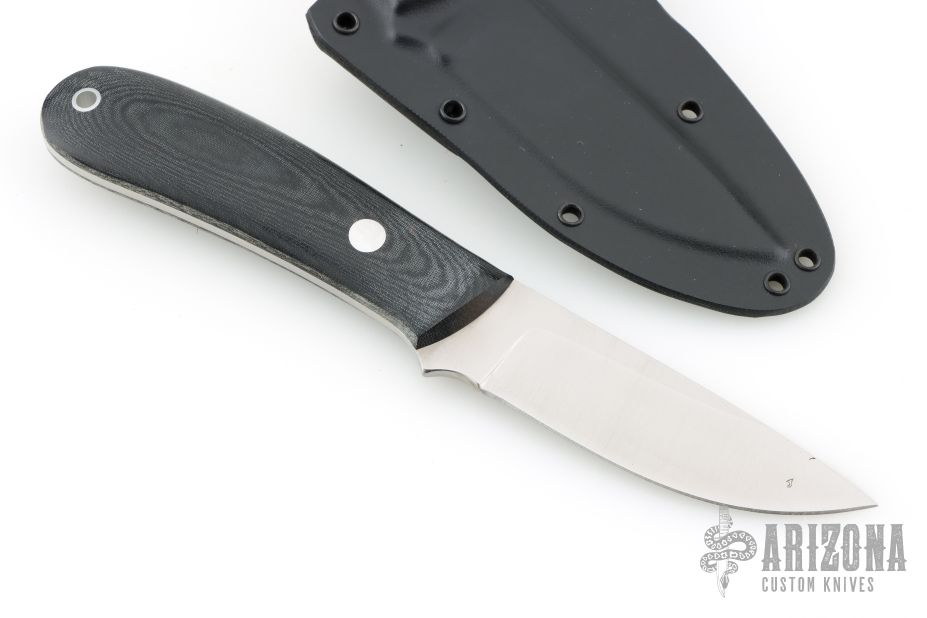 This K-16 Yukon Pro Skinner by Dozier Knives features a satin finished blade with .128" blade stock and 1.040" blade depth, full tang construction. The handle has black linen micarta scales with aluminum pins and lanyard hole. Comes with kydex sheath with belt clip. New from maker.