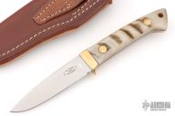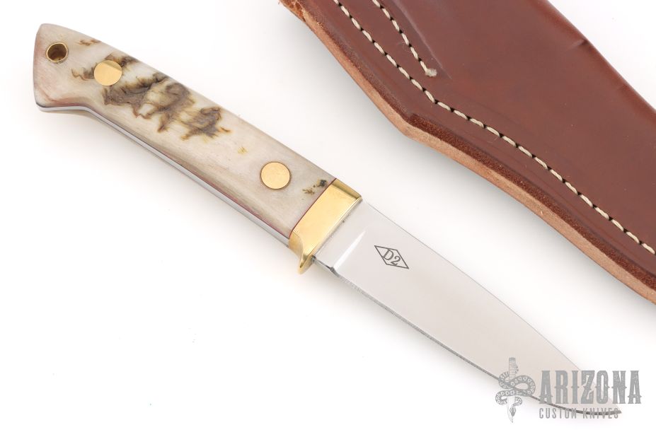 This Boston Mountain Hunter by Bob Dozier features a hand ground satin finished blade, .159" blade stock and .896" blade depth, full tapered tang construction. This knife was hand ground and made solely by Bob Dozier. The handle has a brass guard, sheep horn scales with red liners. Has brass pins and lanyard hole at the butt. Comes with a brown leather sheath. New from maker at the 2026 Blade Show Texas.
