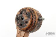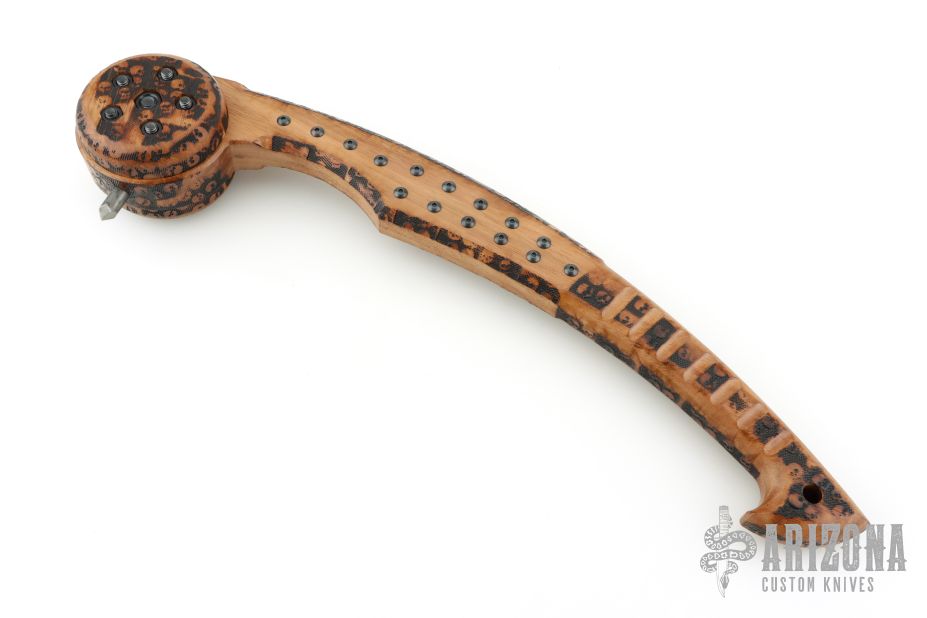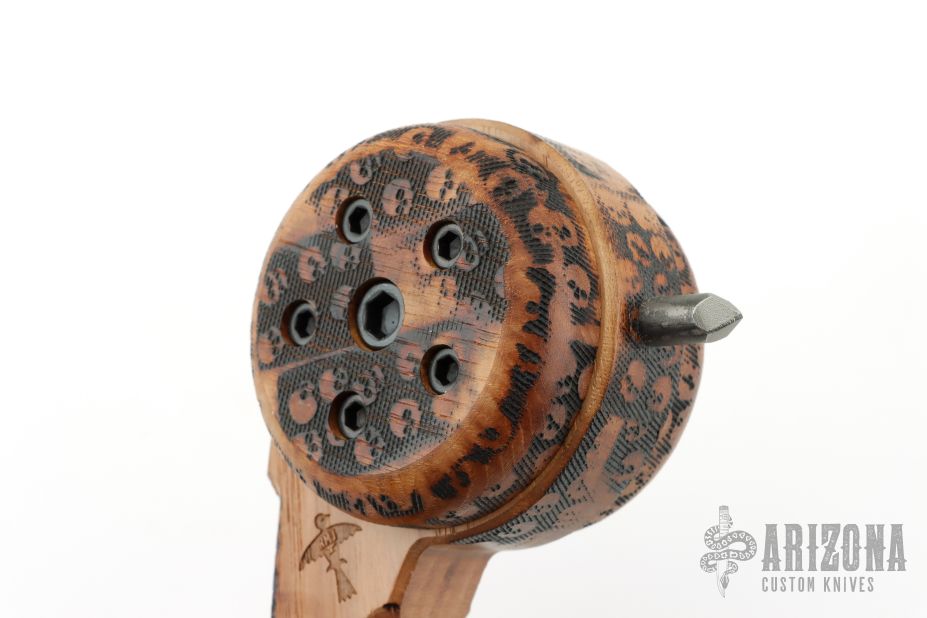 This Ball Club by Ryan Johnson of Gold Point Forge features full hickory construction. Heavy and 3.5" in diameter at the head, 1.5-1" tapered at the handle. File branded with the catacombs pattern. Spike in the head is 1.37" in diameter, and is .625" tall. Mean club! New from maker.