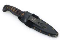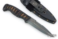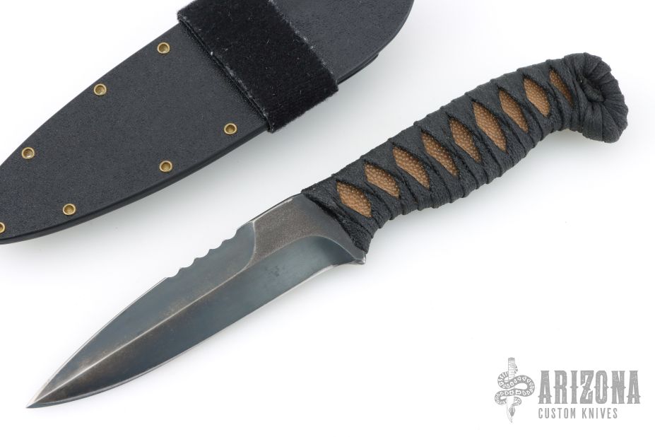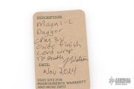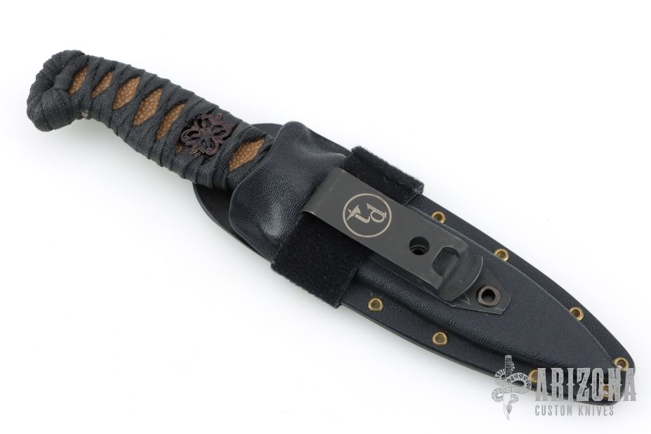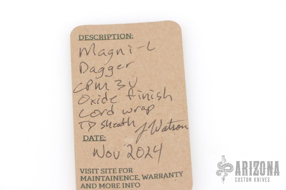 This Magni-L by Joe Watson features a double edged blade with partially serrated top edge, .151" blade stock and 1.015" blade depth, full tang construction. The handle has black cord wrap over tan stingray skin and a menuki. Comes with a kydex Tracker Dan sheath. Comes with pouch and maker's card dated November 2024. Has a couple very light scratches, otherwise excellent condition.