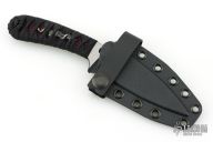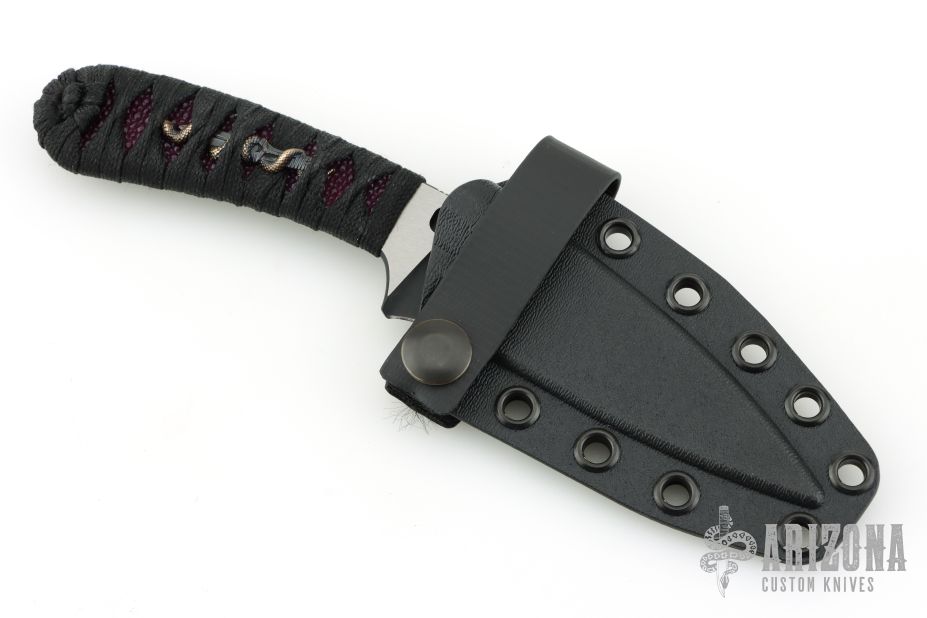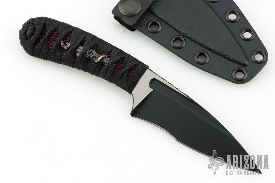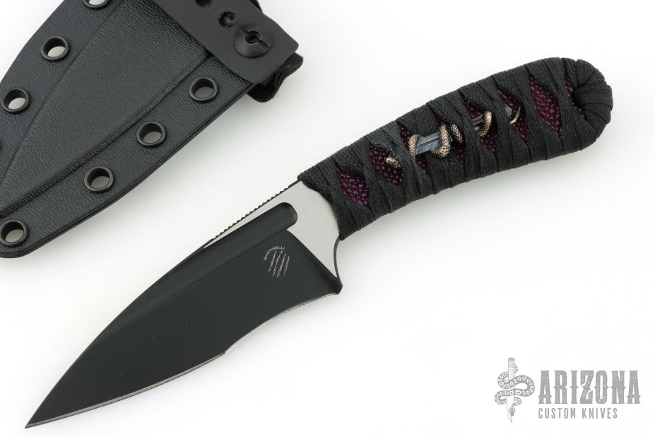 This SIN by Bastinelli Knives features a black/satin recurve blade with notched thumbrest and fullers, .136" blade stock and 1.250" blade depth, full tang construction. The handle has a custom black cord wrap over ray skin and double bronze menuki. Comes with kydex sheath and zippered case. New from maker at the 2026 Texas Blade Show.