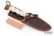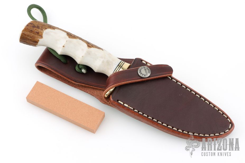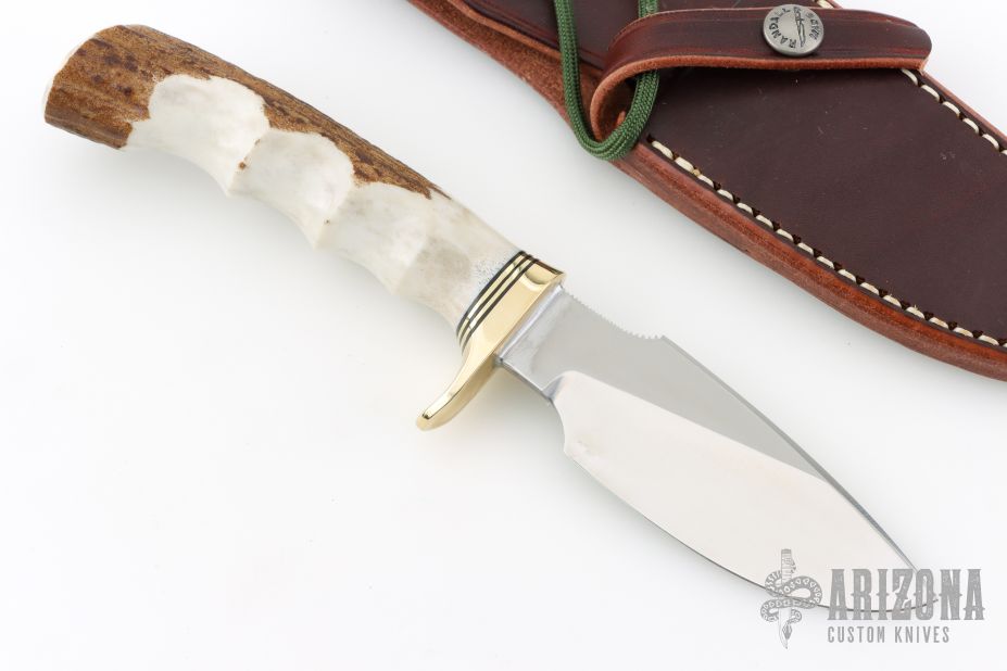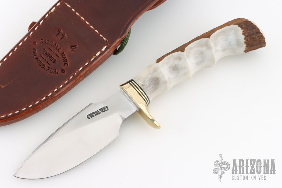The Model 11 is the original drop-point blade. Designed by Tommy Thompson, noted Alaskan guide, in 1952 for big-game skinning, with point dropped below top of blade to prevent cutting too deeply through skins when used point first. This knife has a satin finished blade with notched thumbrest, .148" blade stock and 1.303" blade depth, hidden tang construction. The handle has a brass guard with stag grip with finger grooves, black/brass spacers. Comes with original paper wrapping and brown leather sheath. New from maker.