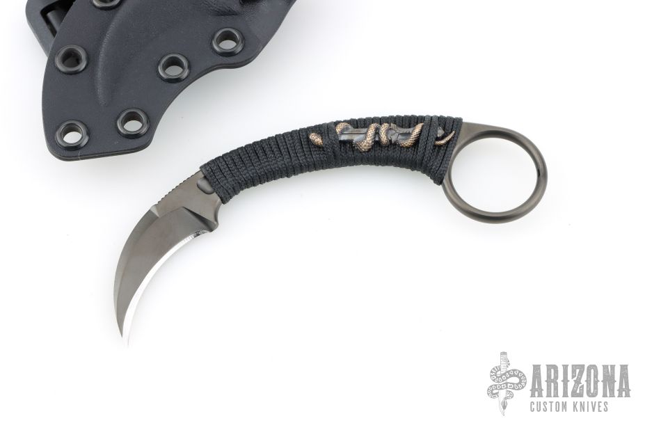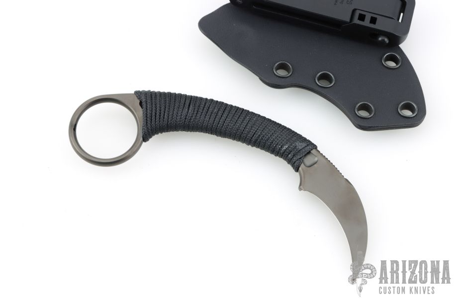This PiKa is a Doug Marcaida design produced by Bastinelli Knives, it features a chisel ground PVD hawkbill blade with swedge, .1590" blade stock and .678" blade depth, full tang construction. The handle has black cord wrap with menuki. Comes with kydex sheath with Dots belt clip and maker's zippered case. New from maker.