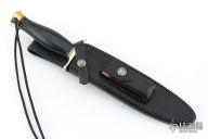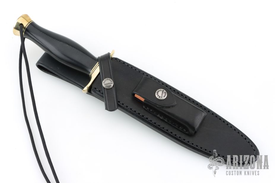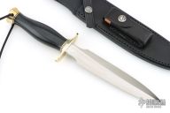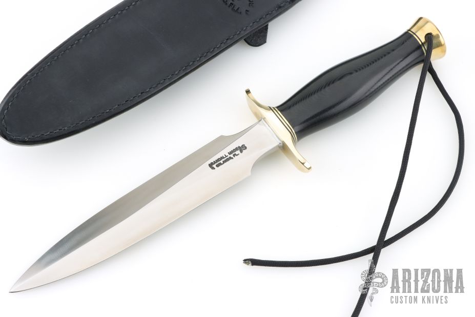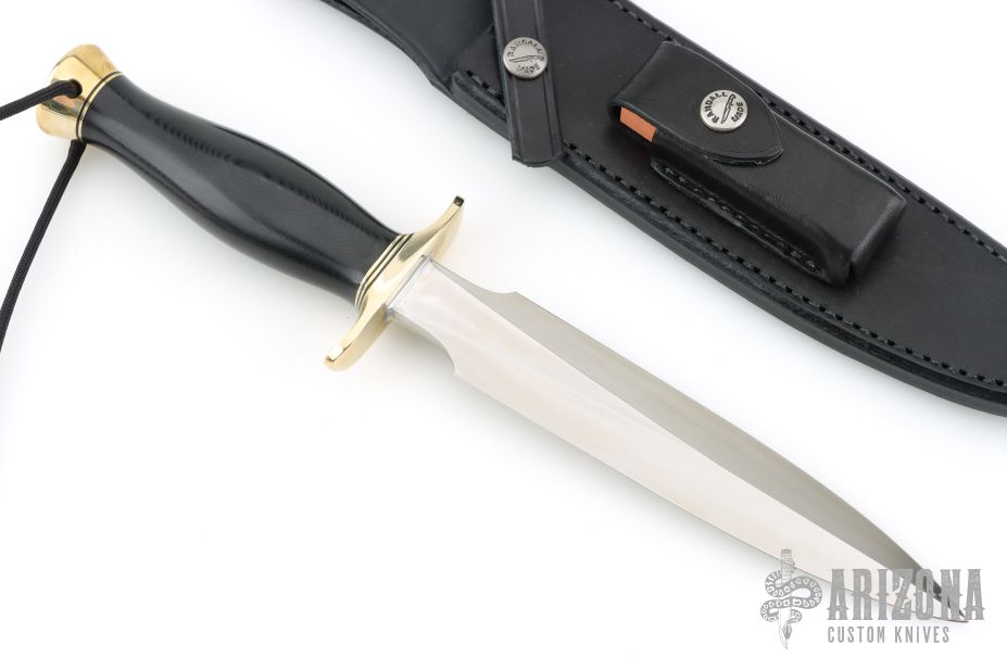 This Model 2-7 by Randall Made knives features a satin finished double edged blade, .253" blade thickness and 1.291" blade depth, hidden tang construction. The Model 2 is a heavily made dagger or dirk. Has a brass double guard and butt with lanyard hole, black linen micarta grip with black/brass spacers. Comes with original paper wrapping and black leather sheath. New from maker.