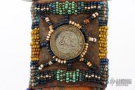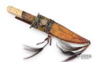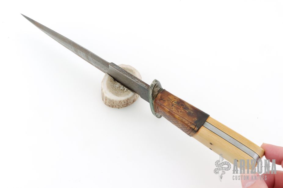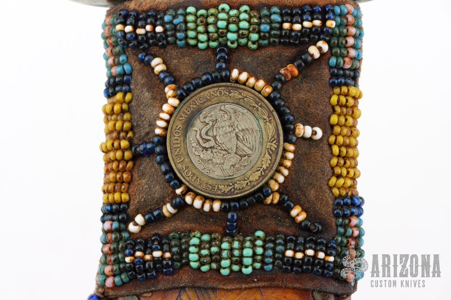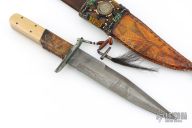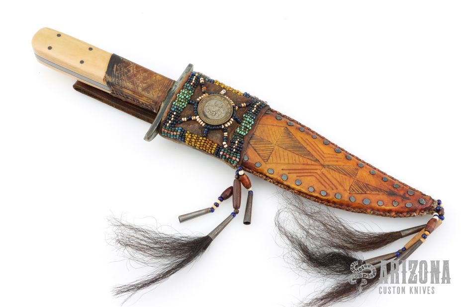 This Fighter by Enedino De Leon features a clip point blade with false top edge, .215" blade stock and 1.439" blade depth, full tang construction. The handle has an antiqued nickel silver guard, ivory paper micarta scales with black liners, tooled leather wrap below the guard. Comes with a beaded and hand tooled brown leather sheath with Mexican coin concho. Excellent condition.