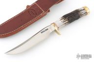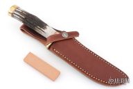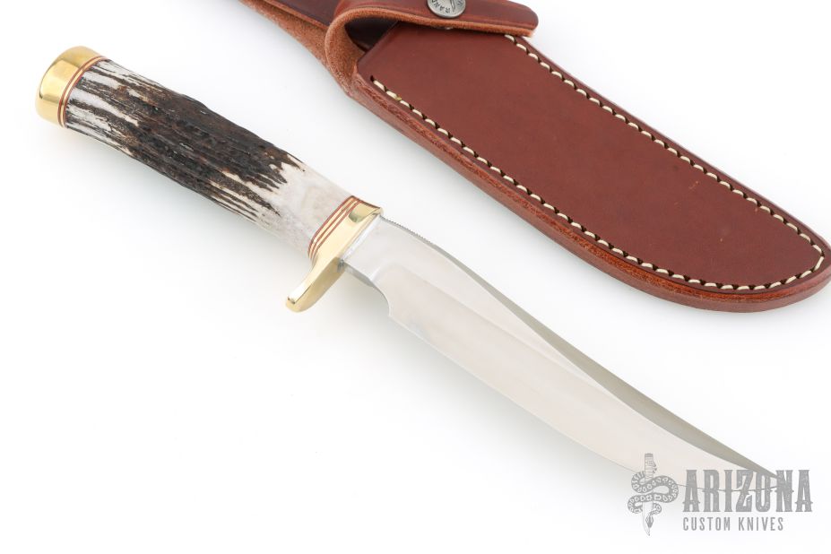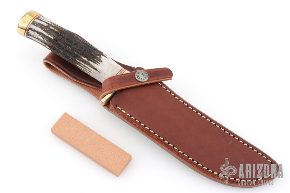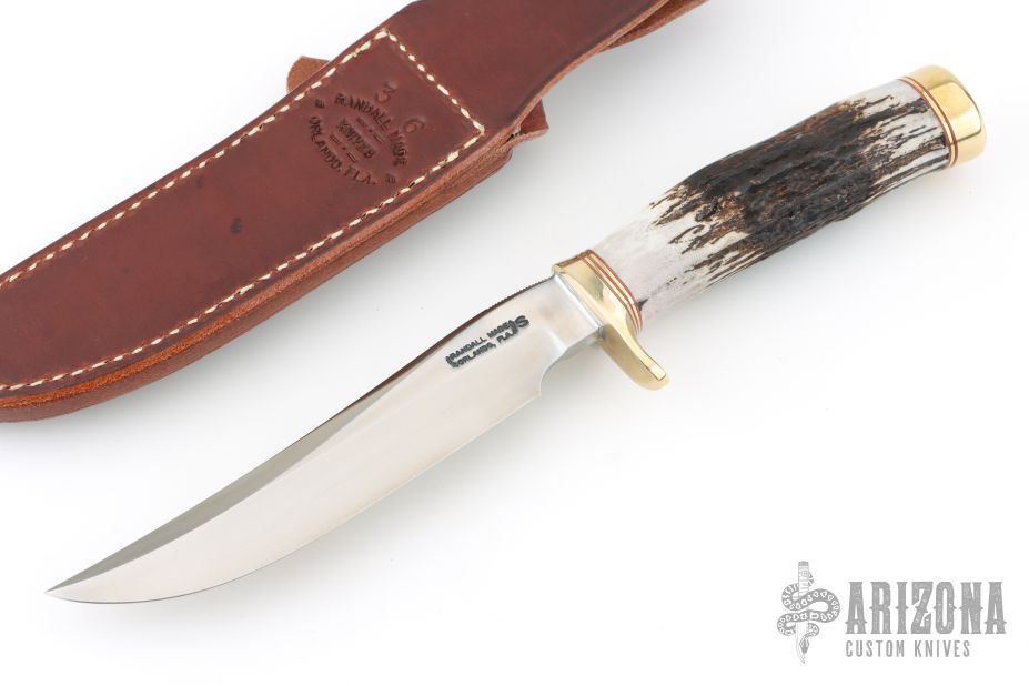 This Model 3-6 by Randall features a satin finished stainless steel blade with false top edge and notched thumbrest, .218" blade stock and 1.122" blade depth, hidden tang construction. The handle has a brass guard and butt, and stag grip with red/brass spacers. Comes with a brown leather sheath and original paper wrapping. New from maker.