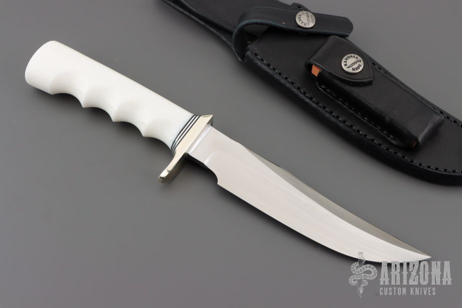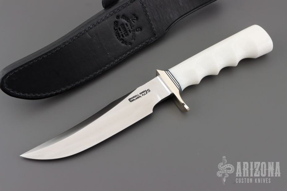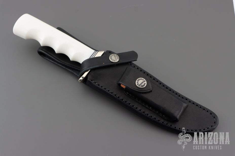This Model 12-6 Little Bear Bowie by Randall Made Knives features a satin finished blade with notched thumbrest and sharpened top edge, .223" blade stock and 1.222" blade depth, hidden tang construction. The handle has a nickel silver guard, imitation ivory grip with finger grooves, black/duralumin spacers. Comes with a black leather sheath and original paper wrapping. New from maker.