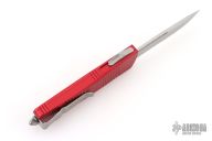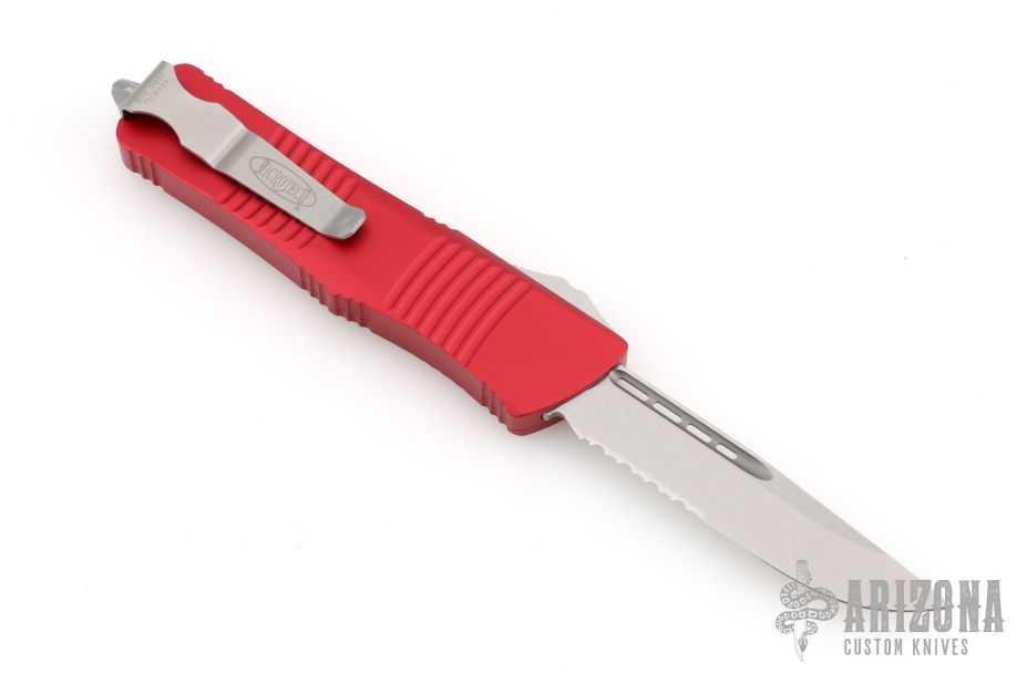 This Troodon OTF Automatic from Microtech features a stonewashed single edge partially serrated blade with fuller. The handle is comprised of red aluminum with a bead blasted stainless steel thumb slide, tip down clip and glass breaker. Dated 11/2022 with a S/N of 11607. Includes original box and papers. Excellent condition.