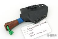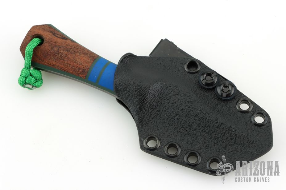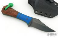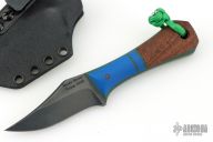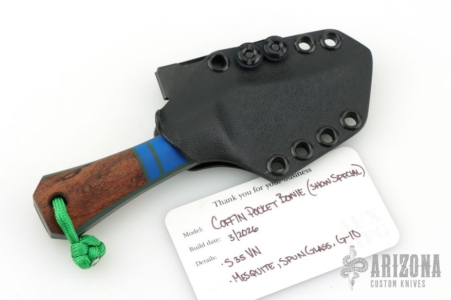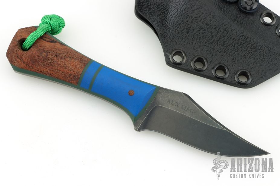 This Pocket Bowie by Auxiliary Manufacturing features an acid tumbled blade with .195" blade stock and 1.18 blade depth. The handle has gray/blue g10 bolsters, and mosquito scales. Comes with original box, and kydex sheath with Ulti-clip. New from maker at the 2026 Blade Show Texas!