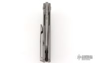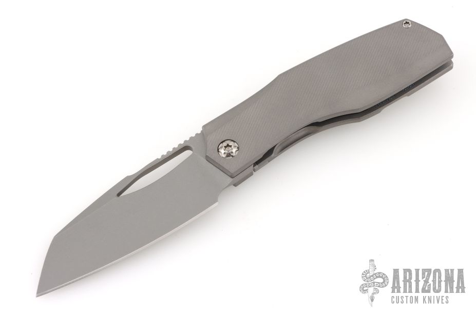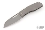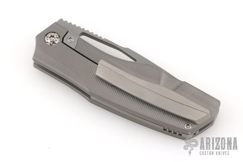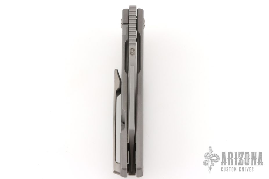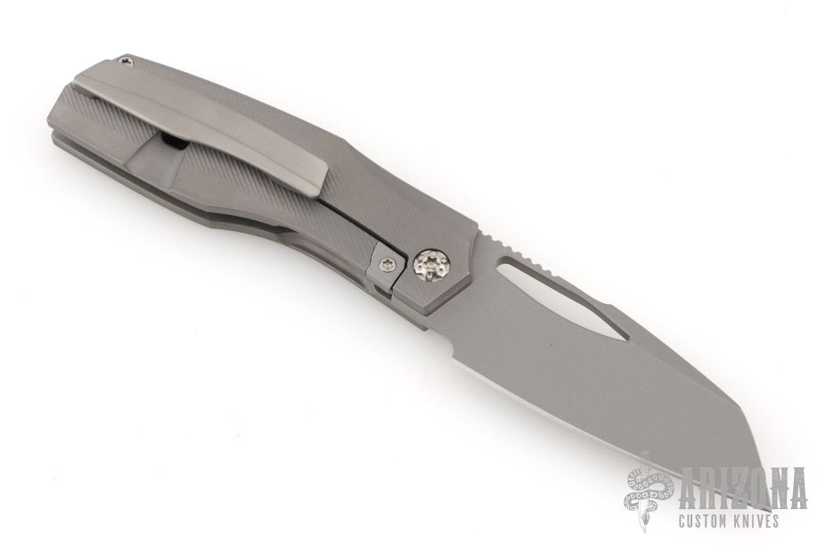 This Protean by Prince Customs is #823. It has an acid/tumble blade with thumb groove and notched thumbrest. The handle has a tumble finished, milled titanium frame with bead blast tip up clip and floating backspacer. Stainless lockface insert. Comes with original box and COA dated 2.26. Detent is a little stiff. Nice action, blade seating, and centering. Excellent condition.
