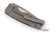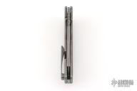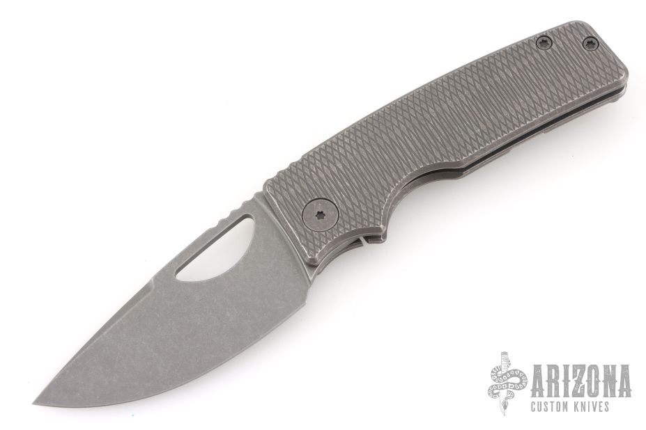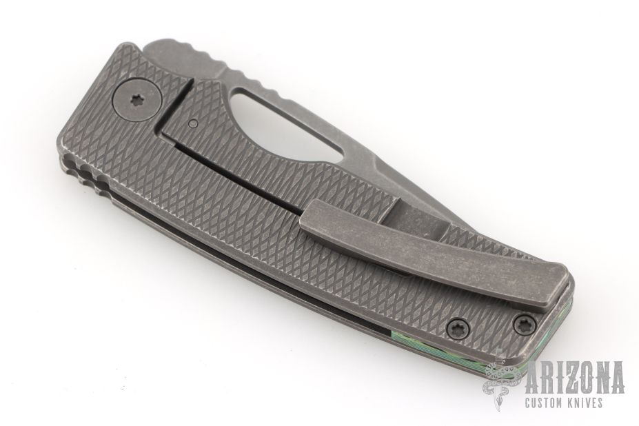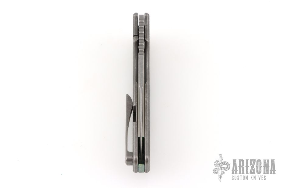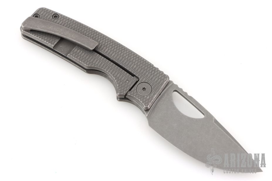 This Roosevelt by the OZ Machine Company features a tumbled Vanax blade with thumbhole and notched thumbrest. The handle features a milled stonewashed titanium frame with a Zircuti backspacer and tip up pocket clip with hidden screws. Includes original velcro case and papers dated 11-10-25 and s/n 4496. Excellent condition.