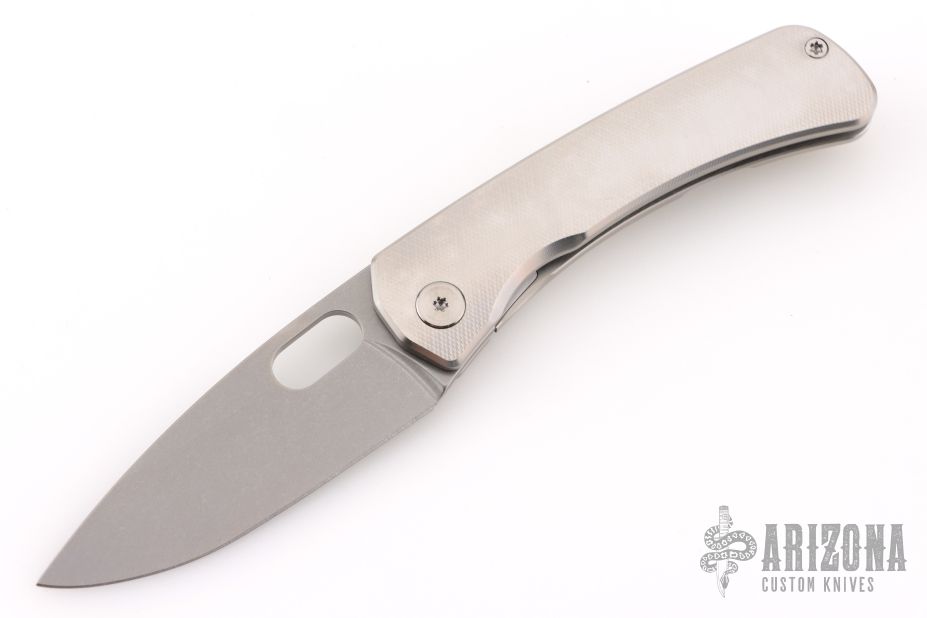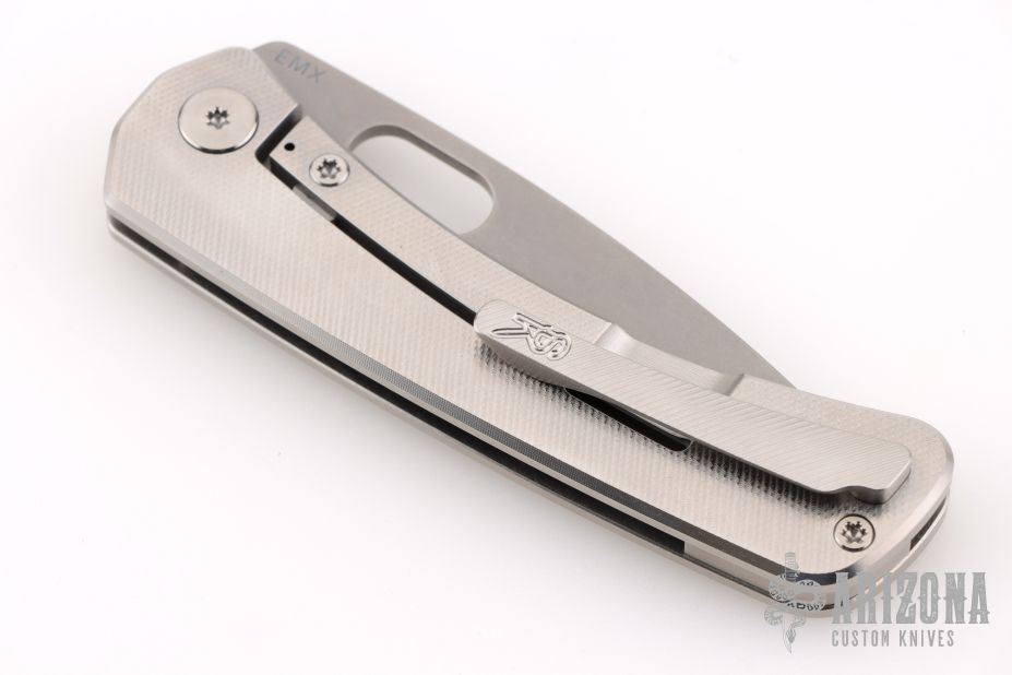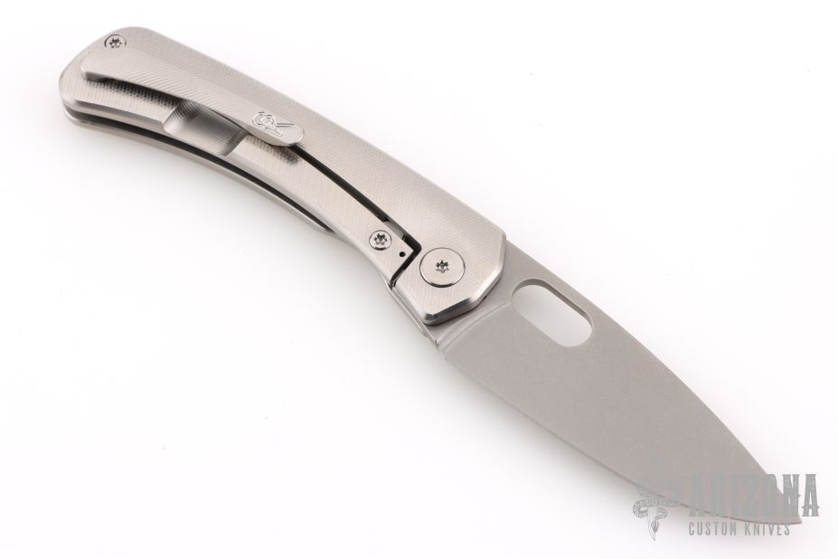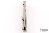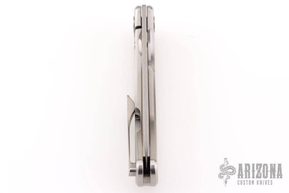 This Lamia by SPK Unlimited features a stonewashed blade with thumbhole. The handle has a XPJX Knurled titanium frame with matching hardware, backspacer and tip up clip with hidden screws. There is a lockface insert and overtravel stop in the frame. Comes with original box. Excellent Condition.