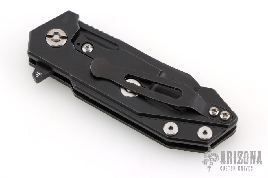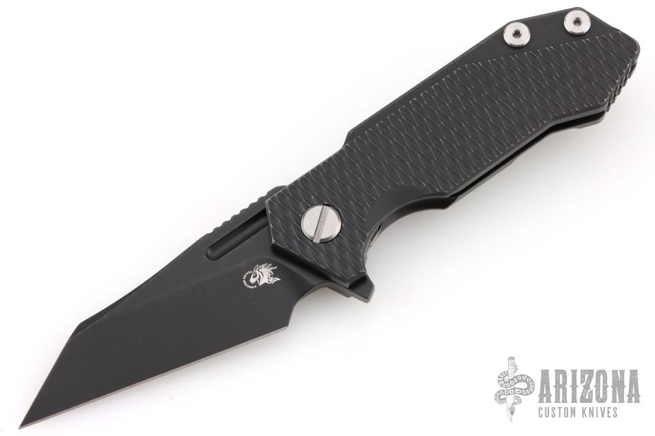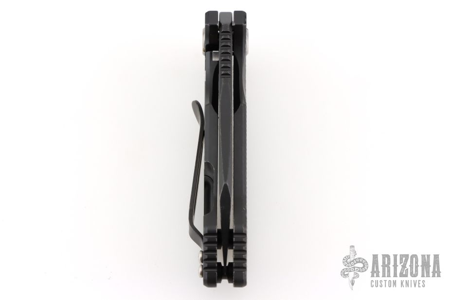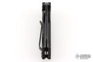 This Half Track from Hinderer Knives features a black stonewash finished blade with swedge, fullers, notched thumbrest and flipper. The handle has a black tumble finished titanium frame over barrel spacers. Titanium clip is positioned for tip up, right hand carry. Tri-Way pivot. Comes with original box, card and extra washers. Excellent condition.