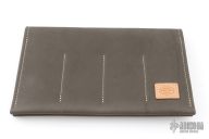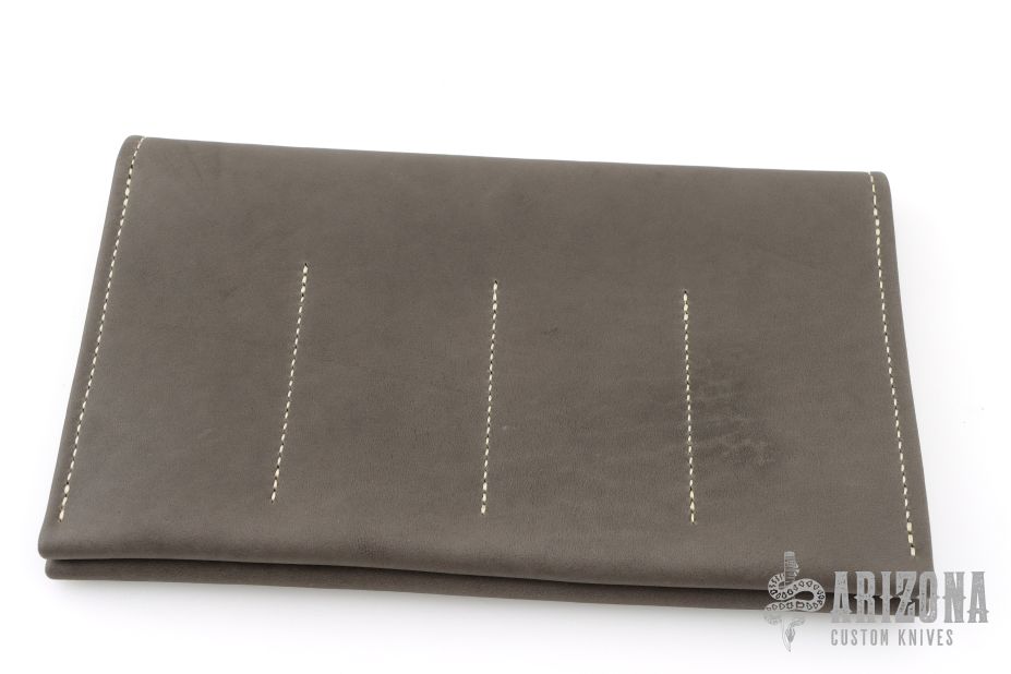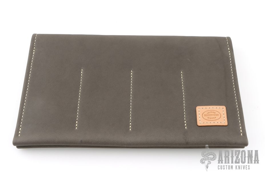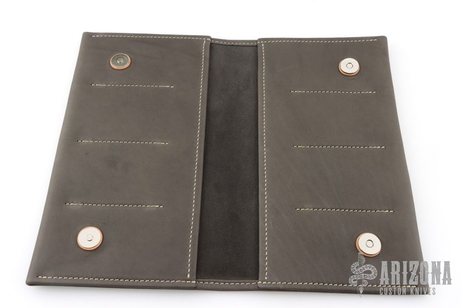 This 8-Knife Case by Robertson Leather Works is made from Dove Gray Leather. It has two magnetic snaps. The pockets are 5" by 2.125". New from maker!