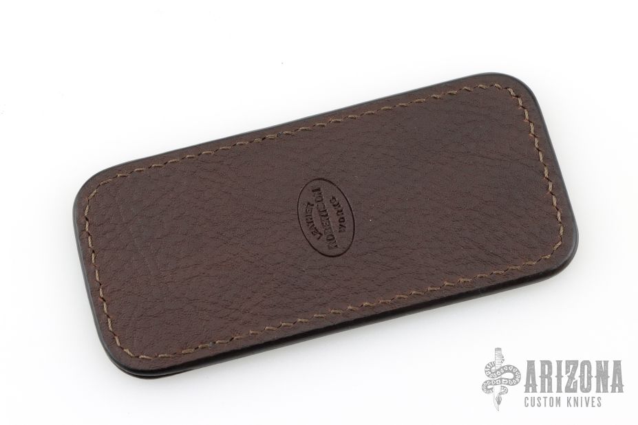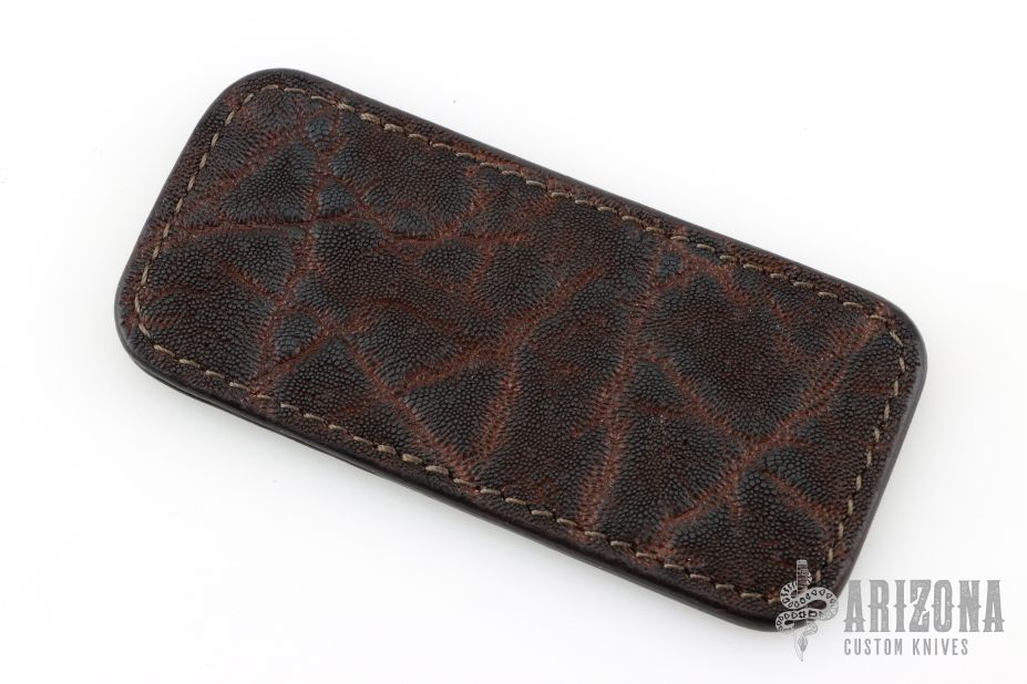 This leather slip sheath by Robertson Leather Works features Chocolate Elephant and brown leather. It is 4.75" long by 2.25" wide. New from maker!
