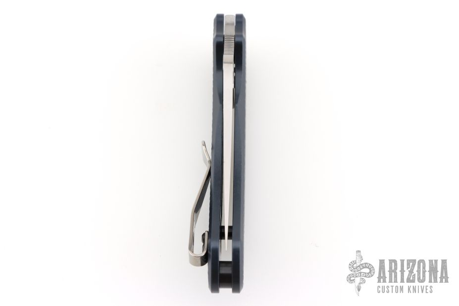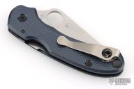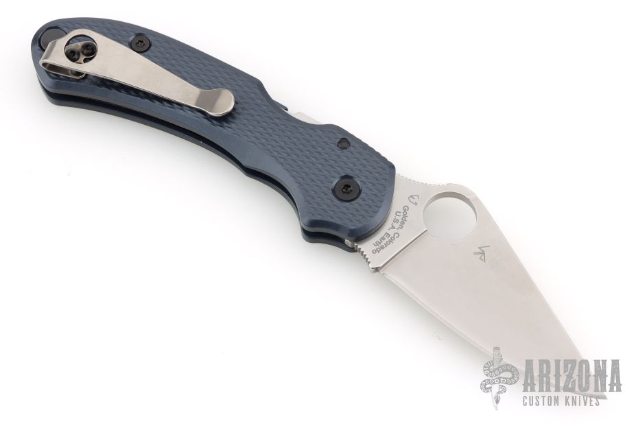 This Para 3 by Spyderco features a satin finished clip point blade with thumb hole and notched thumbrest. The handle has aftermarket AWT cobalt blue checkered frame over nested steel liner and stand-offs. Lynch NW titanium deep carry clip. Includes original box and paperwork. Listing includes the original scales, clip, and hardware. Excellent condition.