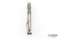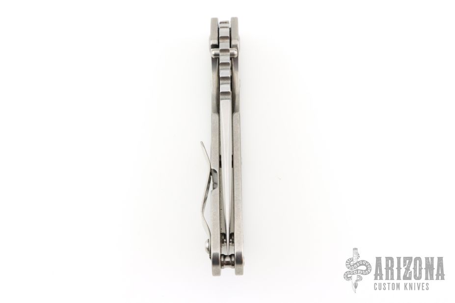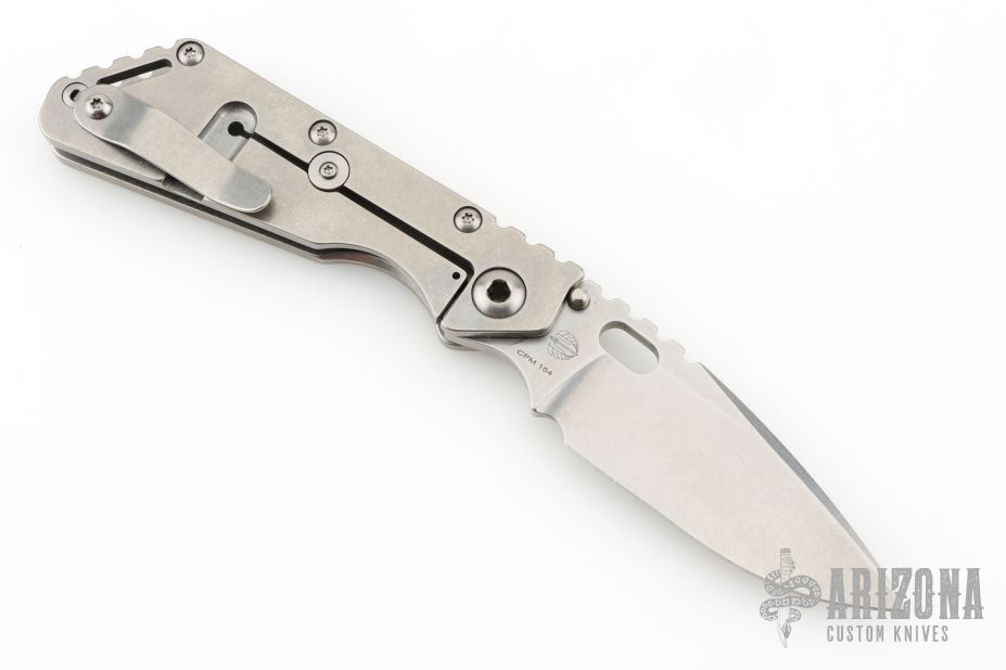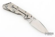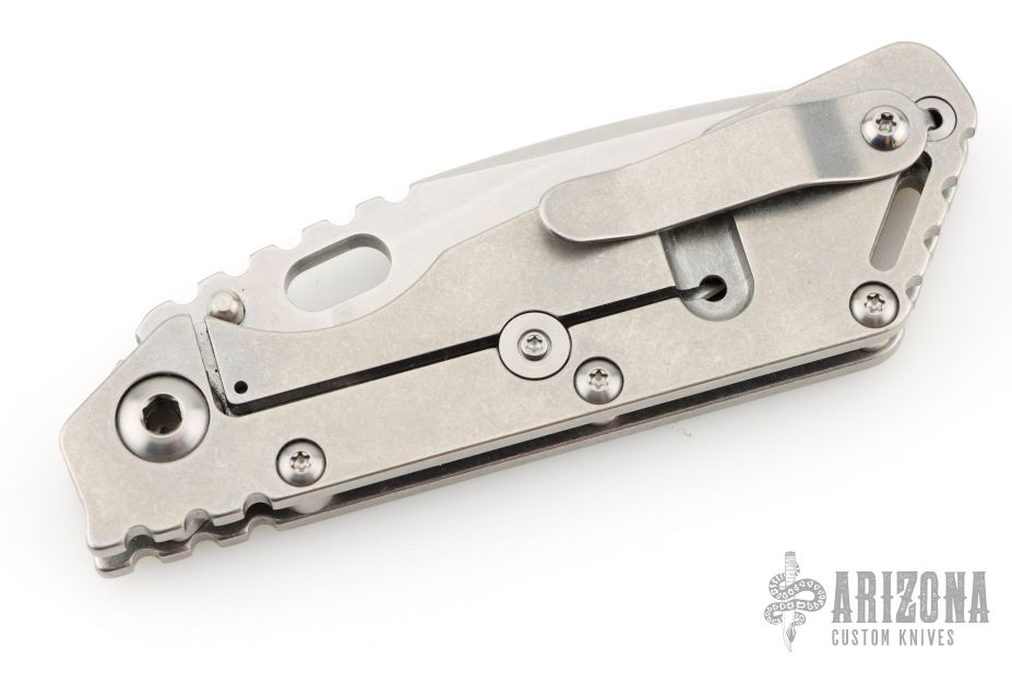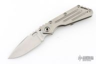 This Mick Strider Performance Series SMF framelock folder features a spear point 3/4 grind blade with thumbhole and notched thumbrest. The handle has a stonewashed titanium frame with titanium clip, tip up deep carry clip. Jimping on blade spine. Includes Hinderer "Lock Bar Stabilizer" for maximum reverse lock retention. Nice detent, lockup and blade seating. Excellent Condition.