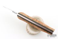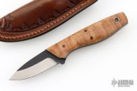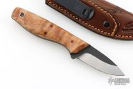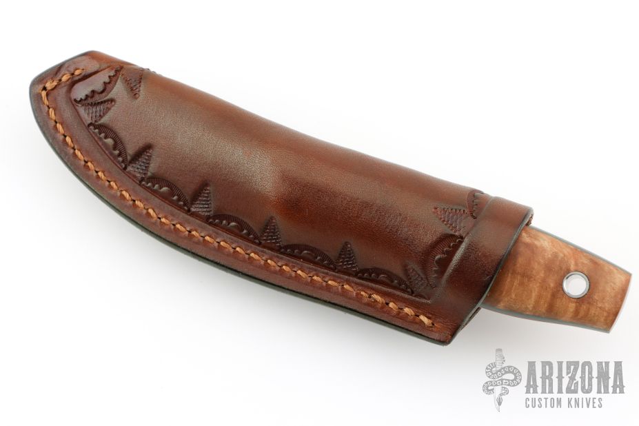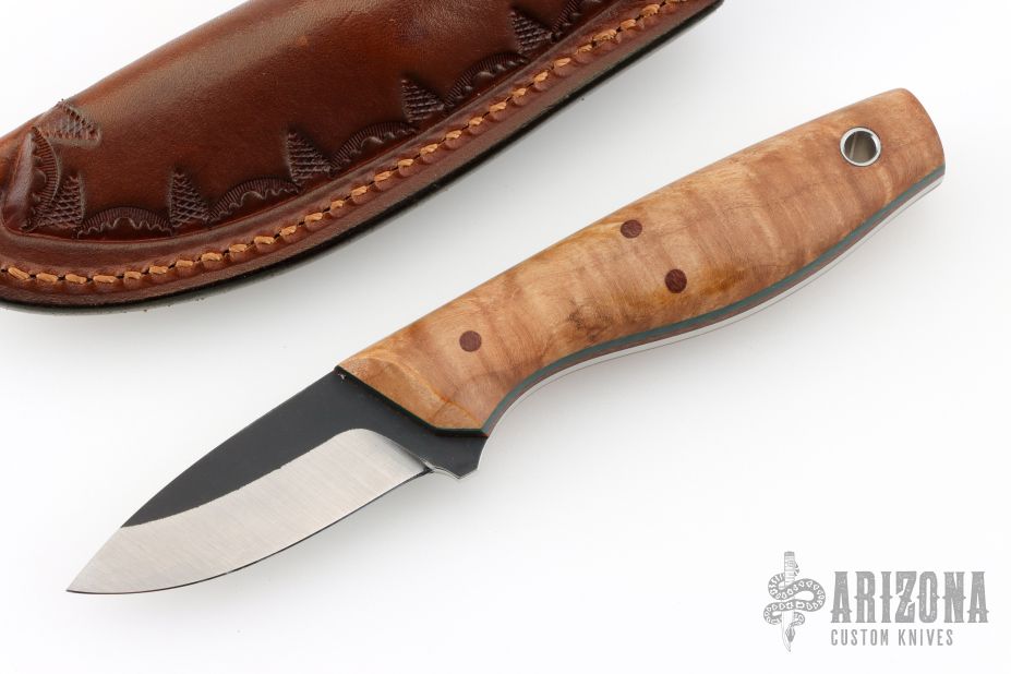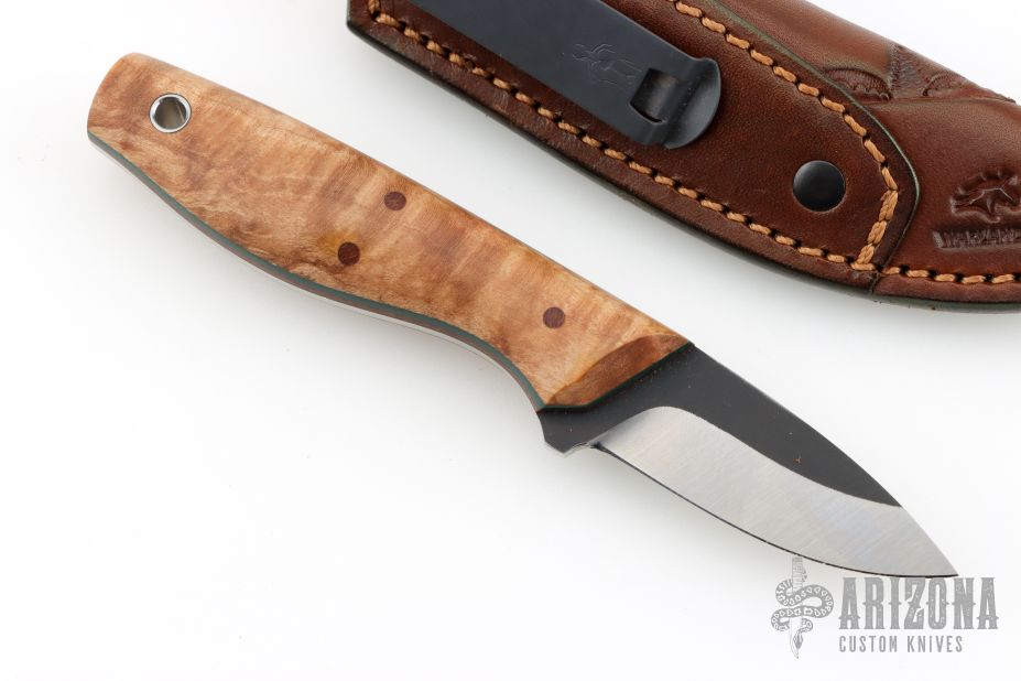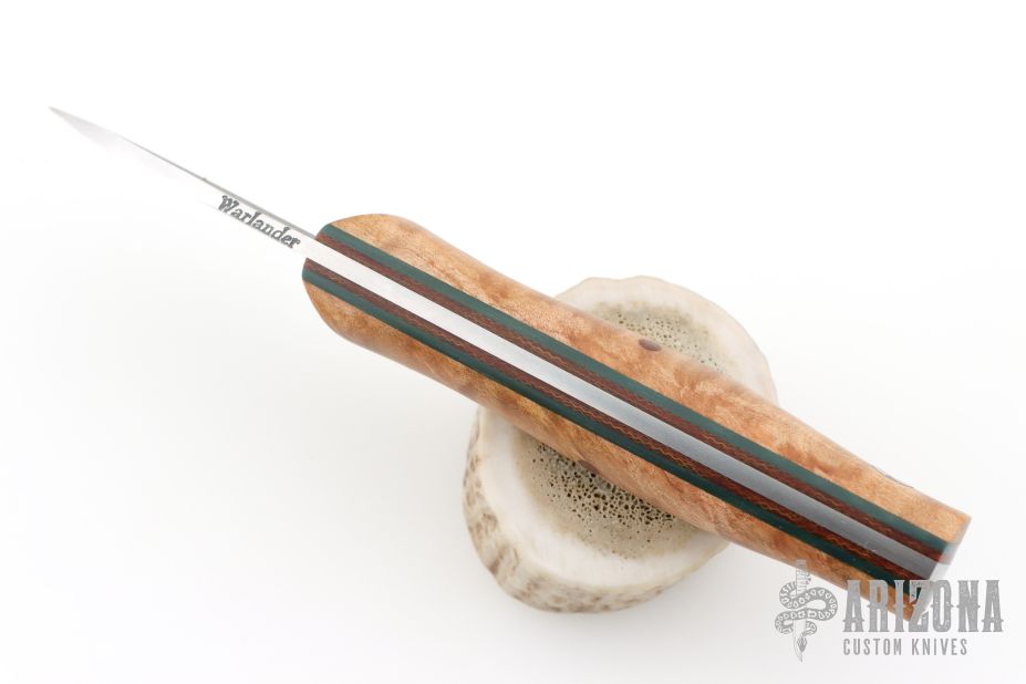 This Talon by Warlander Enterprises features a flat ground drop point blade with black flats, .105" thick blade with .826" blade depth, full tang construction. The handle has curly maple scales with micarta liners.  Includes a brown leather sheath.  Excellent Condition.