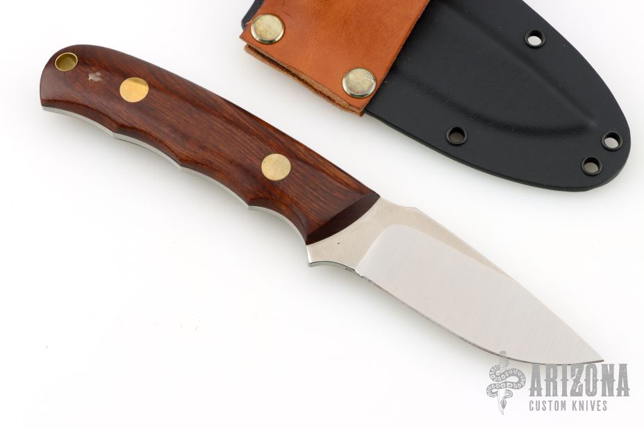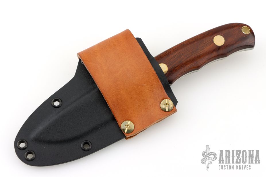 This K-9M Modified Personal Utility by Dozier Knives features a satin finished blade with .125" blade stock and .958" blade depth, full tang construction. The handle has wood scales with brass pins and lanyard hole. Comes with kydex sheath.  Excellent condition.