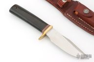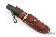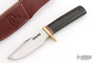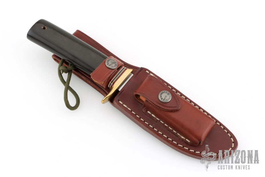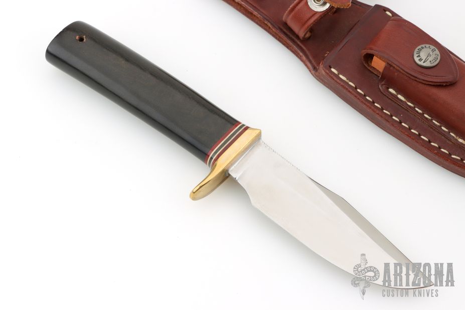 This Model 23 "Gamemaster" by Randall Made Knives features a satin finished clip point blade with sharpened top edge and a notched thumbrest, .202" blade stock and 1.245" blade depth hidden tang construction. The handle has a brass guard and a black linen micarta grip with red/white/blue spacers. Comes with a brown leather sheath. Excellent condition.