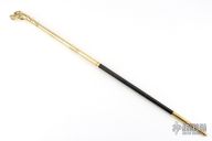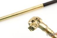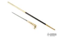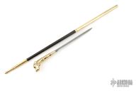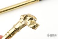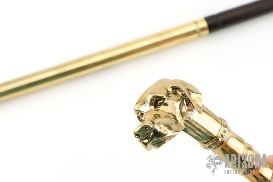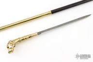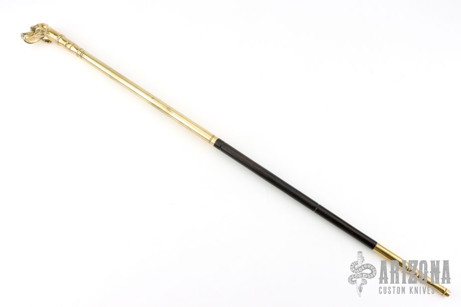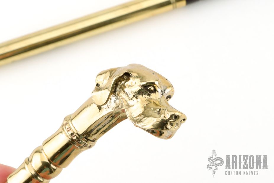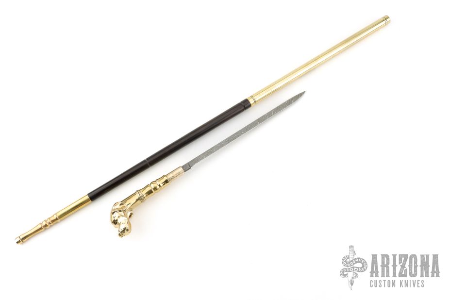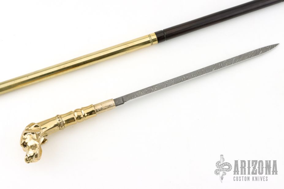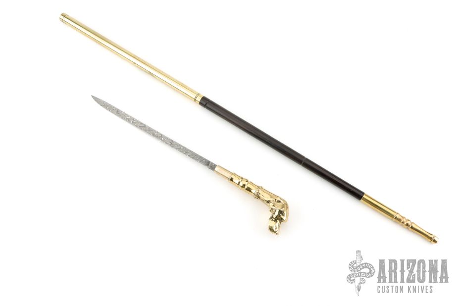 This sword cane by Armenian Doctor Knives features a Zladinox Damascus blade with .158" blade stock and .411" blade depth, hidden tang construction. The handle of the sword and cane is cast and carved bronze. The length of the knife portion of the cane is 9.625" blade and 14.75" overall, the cane in total is 32" overall. The cane is bronze and ebony wood. New from maker!