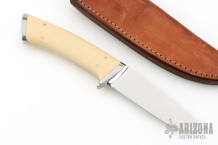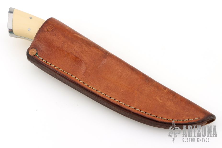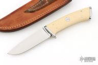 This integral Hunter by Ted Dowell features a drop point high satin finished blade, .175" blade stock, 1.013" blade depth, integral tapered tang construction with ivory paper micarta inlays. Comes with a brown leather sheath and a zippered case. Excellent condition.