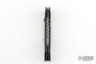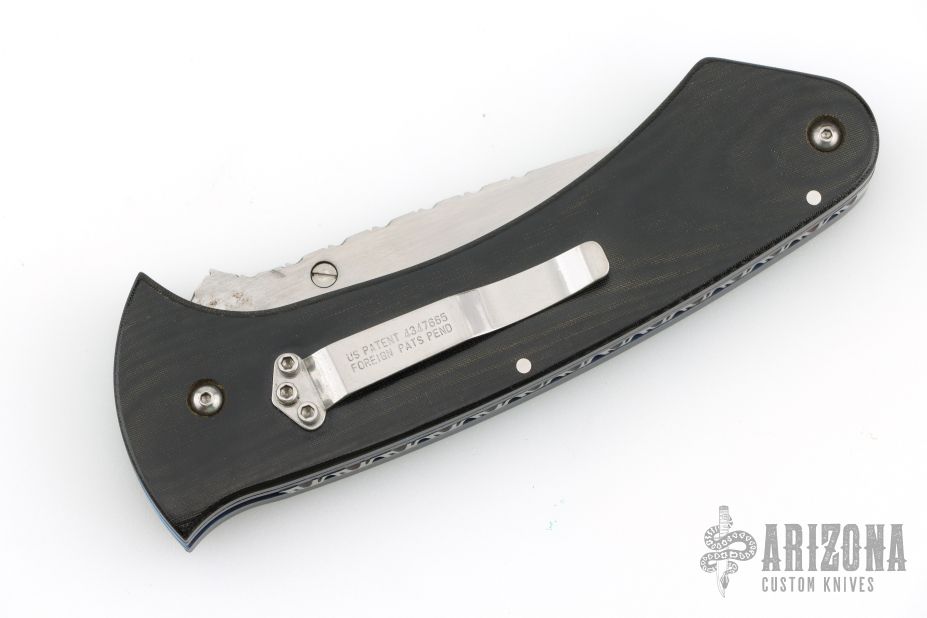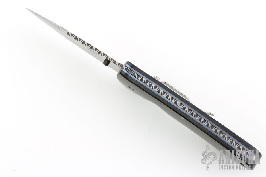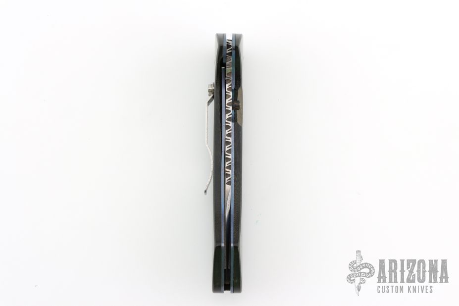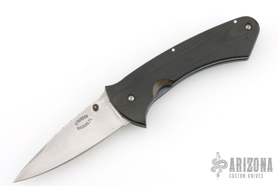 This linerlock folder by Dick Atkinson features a hand rub satin finished blade with single thumbstud and fileworked spine. The handle has micarta scales, anodized titanium liners, tip down stainless steel tip down clip, fileworked stainless steel backspacer. Lockup is late, the blade is mostly centered. Has some scratches and marks. Great overall condition.