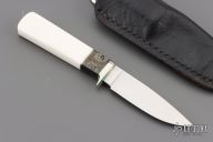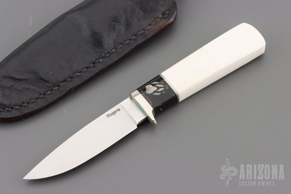 This knife by Richard Rogers features a hand rub satin finished blade with .085" blade stock and .578" blade depth, hidden tang construction. The handle has a nickel silver guard, walrus ivory grip, buffalo horn and nickel silver spacers. Has scrimshaw by Beauchamp dated '92. Comes with a black leather sheath. Excellent condition.