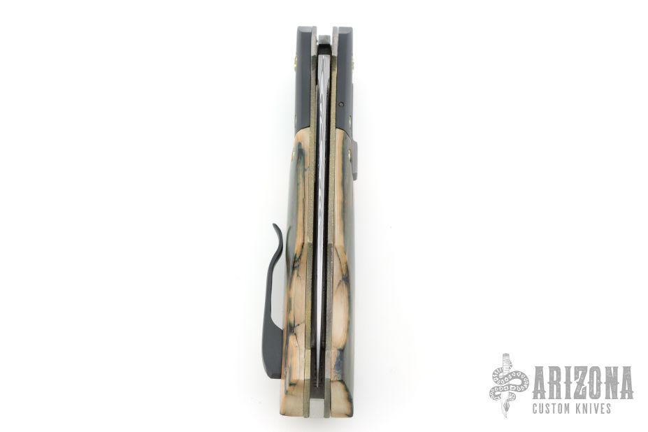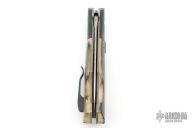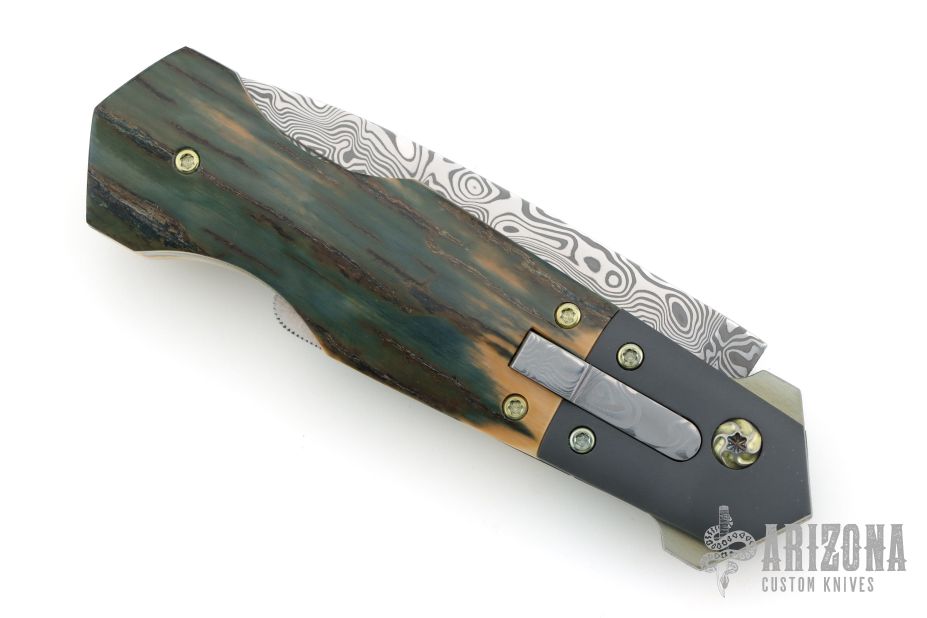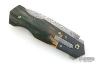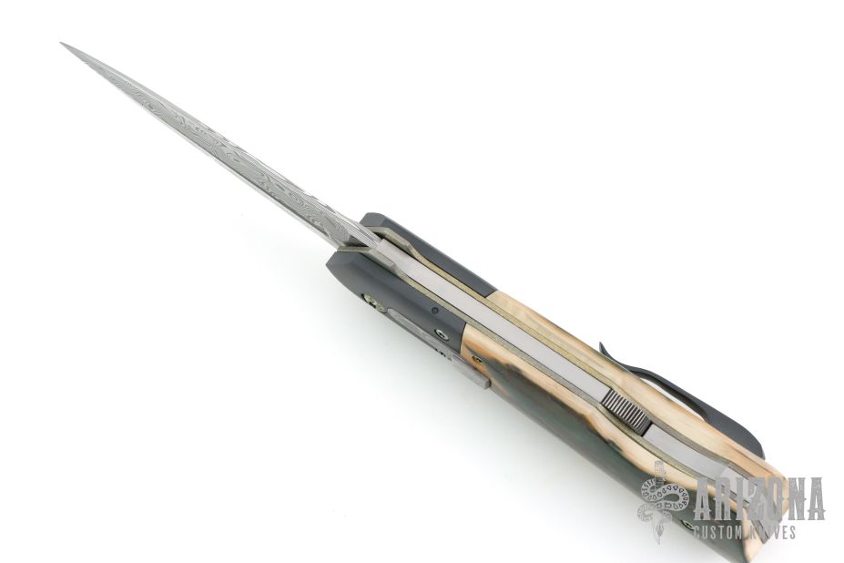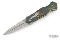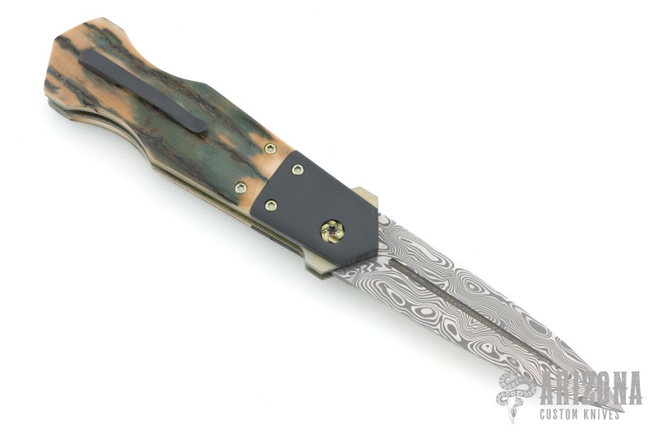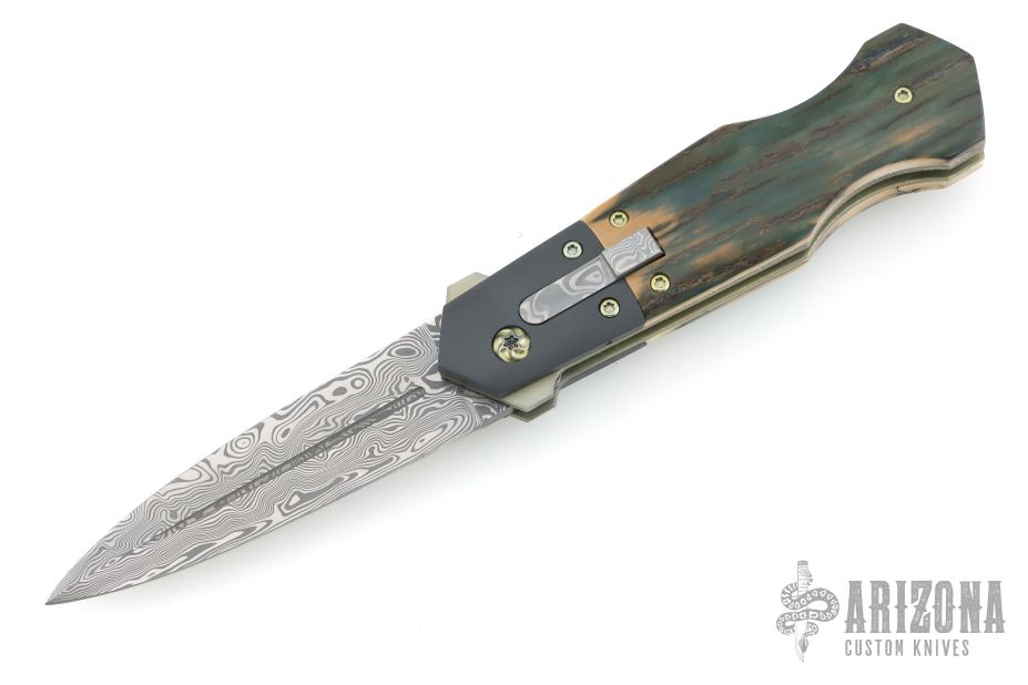This DNGR-D! Auto by Phil Booth features a Damasteel blade with fullers and false top edge. The handle has a dovetailed and bead blasted zirconium bolters, mammoth ivory scales, orange peel finished and anodized titanium liners, Damasteel rockerbar, stainless steel backspacer, tip up bead blasted zirconium clip with hidden screws. Nice lockup, action and blade seating. Comes with a zippered case. Excellent condition.