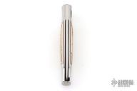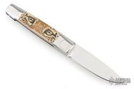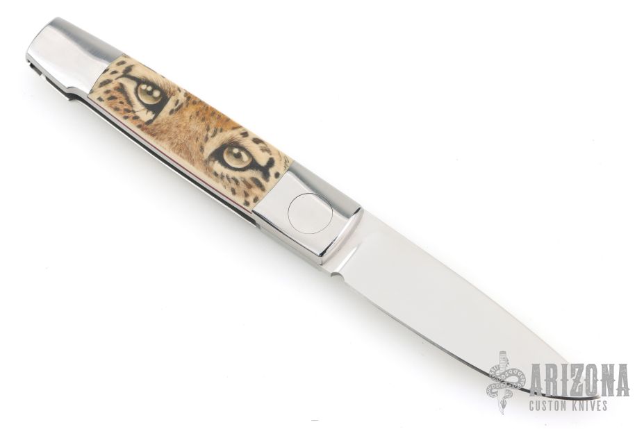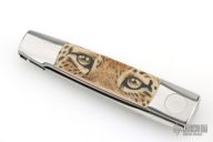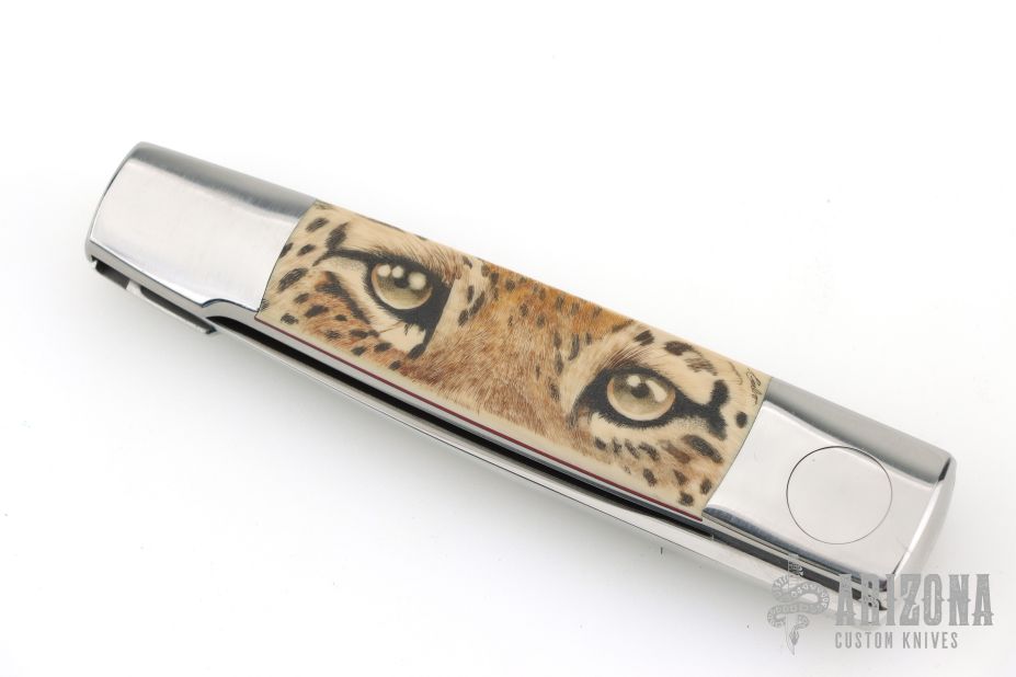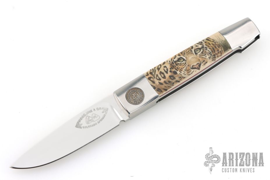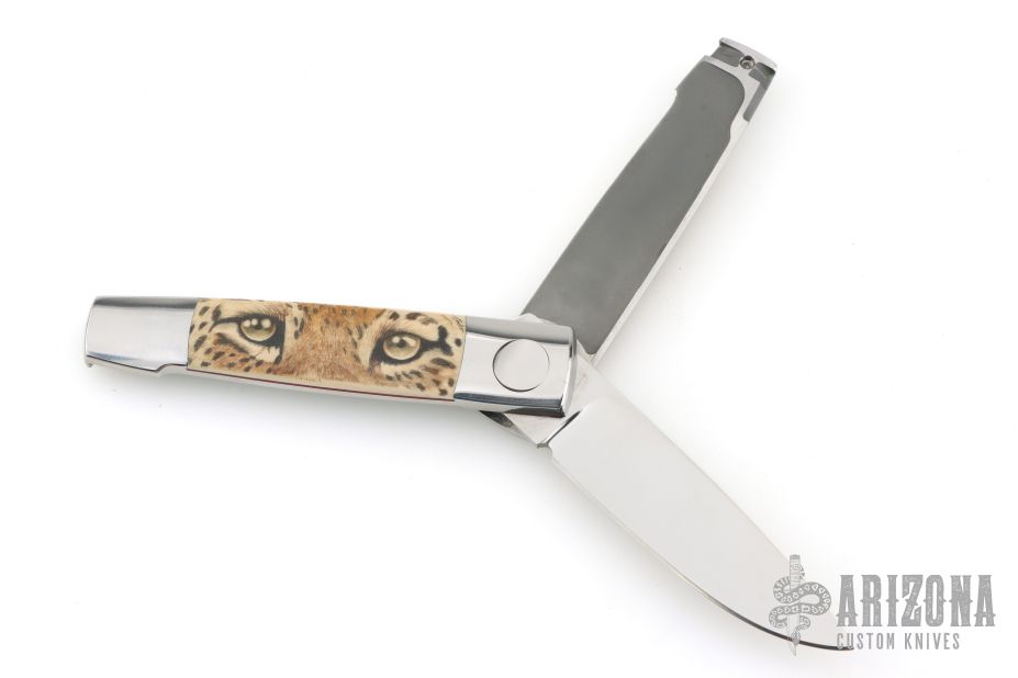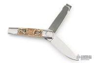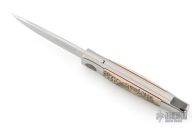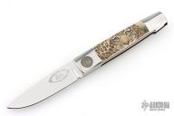 This Barry Wood and Mike Irie swing lock folder features a mirror finished blade and satin polished stainless steel frame with mammoth ivory scales that have been scrimshawed by Carbo. The pivot has a 25th Anniversary Knifemakers Guild medallion. This is a very unique scissor opening folder, which when the blade is fully open and locked in place is almost a fixed blade knife. The handle is nicely contoured for a comfortable grip. Opening is accomplished by lightly pressing down and outward at the rear indentation on the spine, which releases the locking pin and allows one side of the handle and the blade to rotate down then forward until the blade locks in the forward position. The one side of the handle continues to rotate back until it locks in place. Closing requires the same slight thumb pressure at the indentation to release the locking pin, then the one side of the handle is rotated back and around, catching the blade and aligning both with the other side of the handle in a locked closed position. Nice function. Has a few light scratches, otherwise excellent condition for age. Comes with a zippered case.