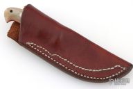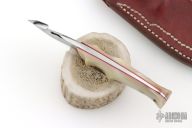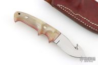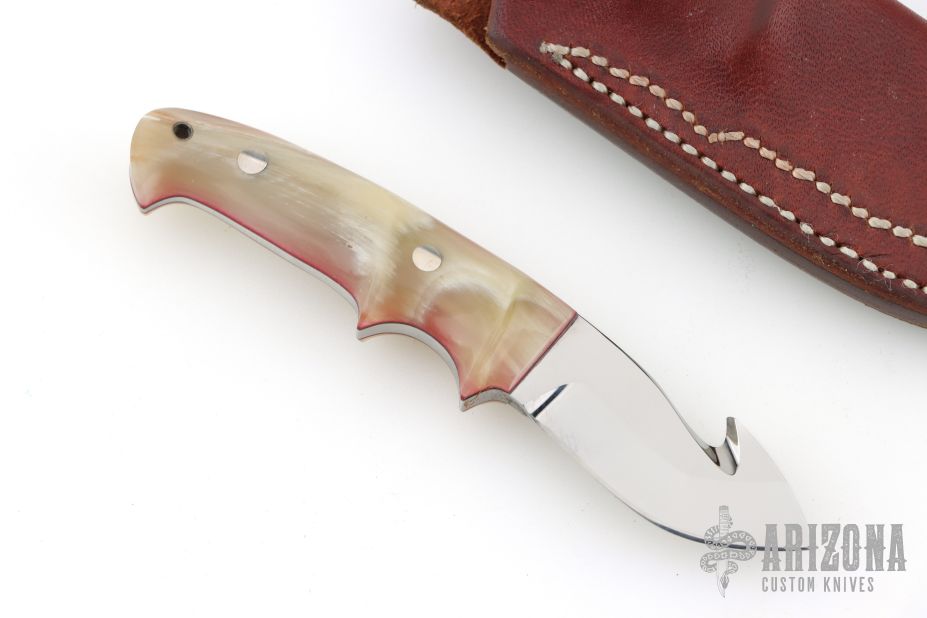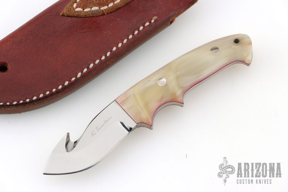 This Miniature Loveless Style Improved Handle Guthook Skinner by Kunihiko Tamatsu features a mirror polished blade with guthook, .138" blade stock and .775" blade depth, full tapered tang construction. The handle has sheep horn scales with red liners. Excellent condition. Beautifully crafted. Comes with brown leather sheath.