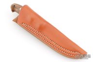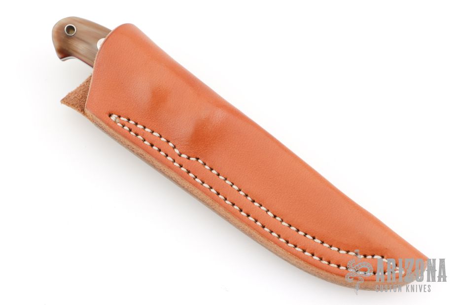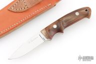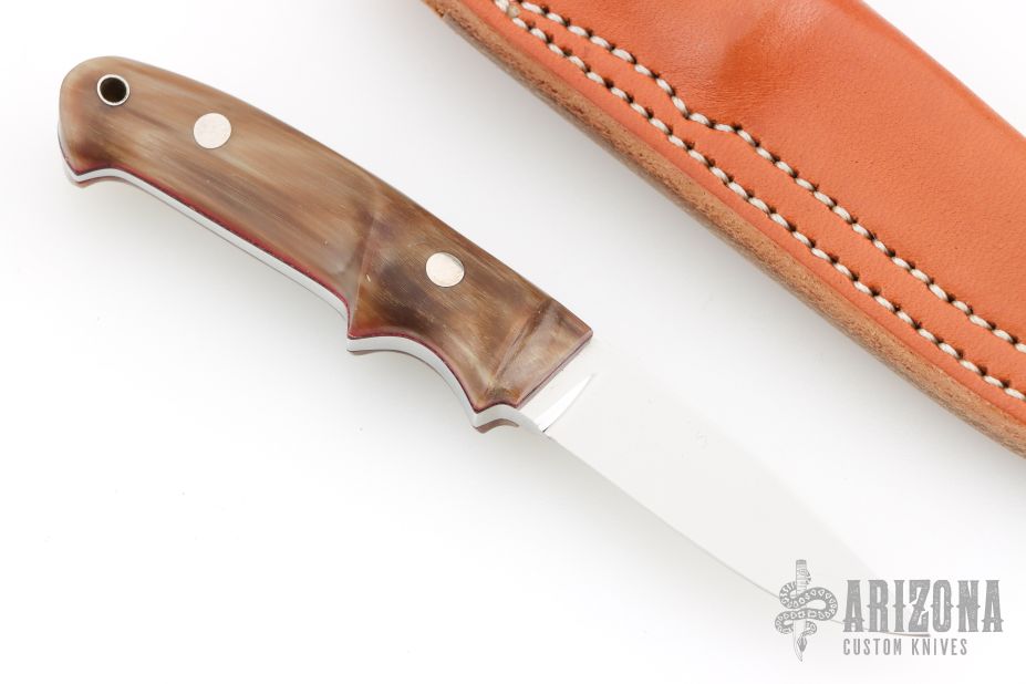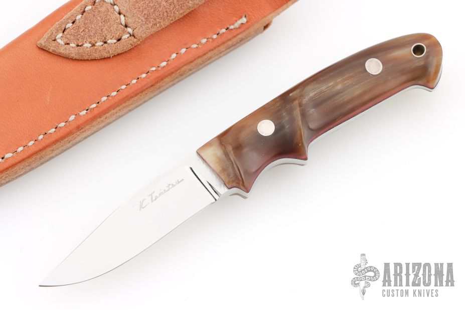 This Miniature Loveless Style Improved Handle Clip Point Hunter by Kunihiko Tamatsu features a mirror polished blade with .133" blade stock and .505" blade depth, full tapered tang construction. The handle has sheep horn scales with red liners. Excellent condition. Beautifully crafted. Comes with brown leather sheath.