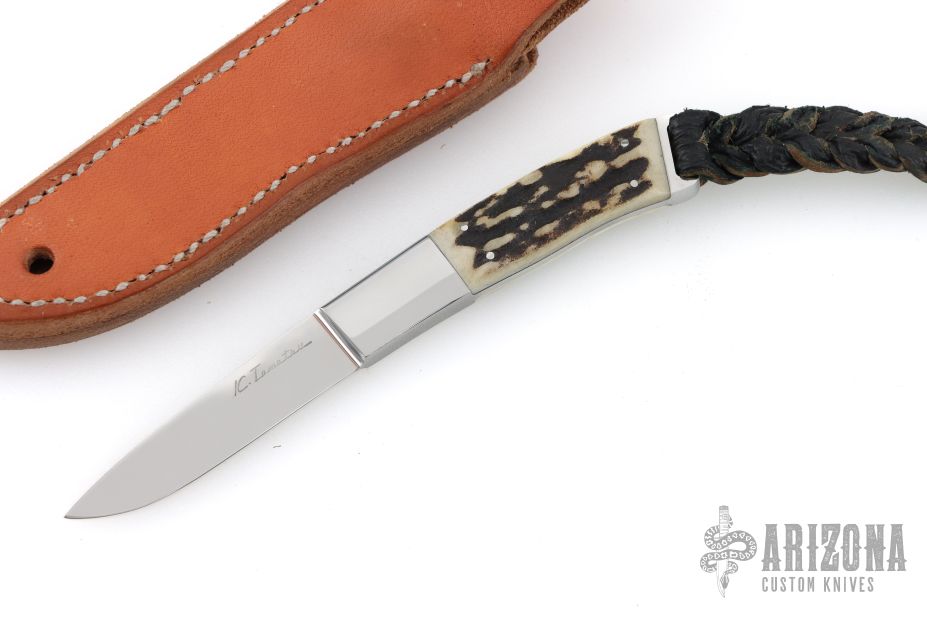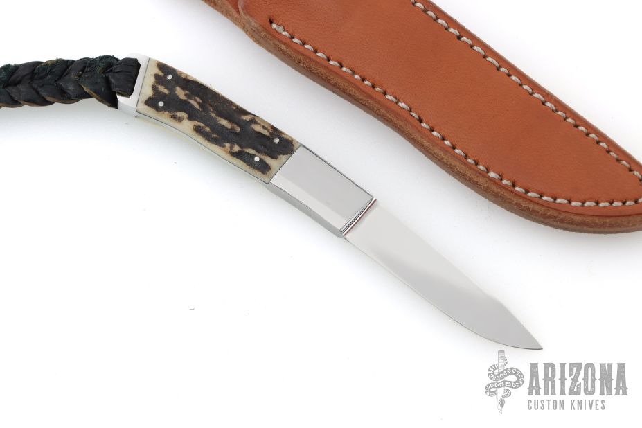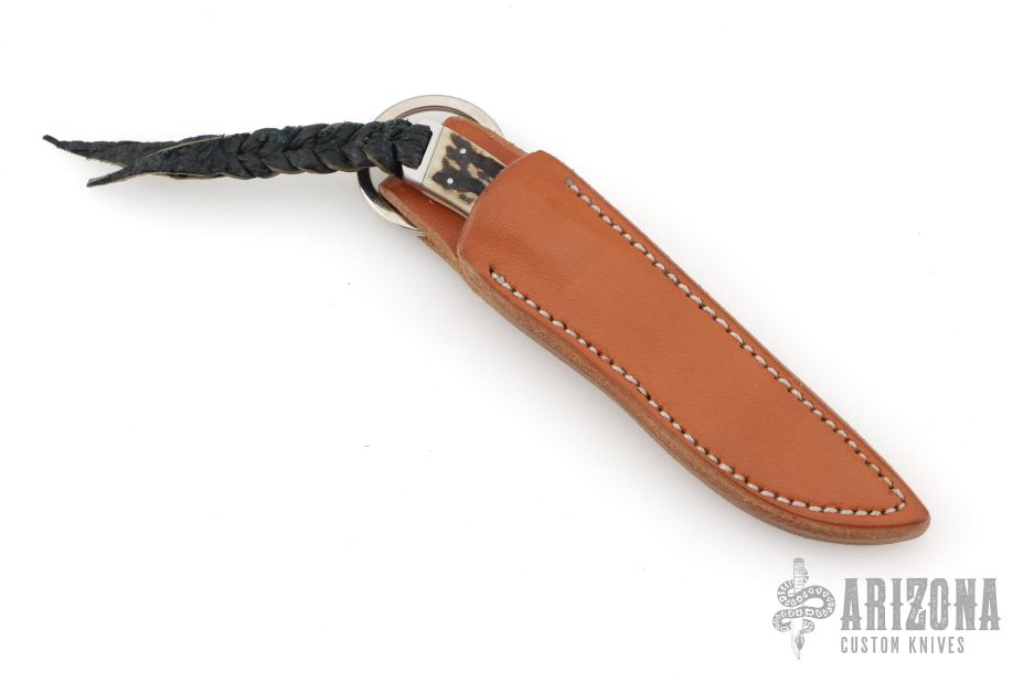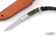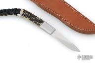 This Miniature Loveless Style Integral Hunter by Kunihiko Tamatsu features a mirror polished blade with checkered thumbrest, .071" blade stock and .410" blade depth, full integral tang construction. The handle has integral bolsters and stag scales, lanyard hole. Excellent condition. Beautifully crafted. Comes with brown leather sheath.