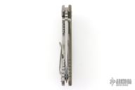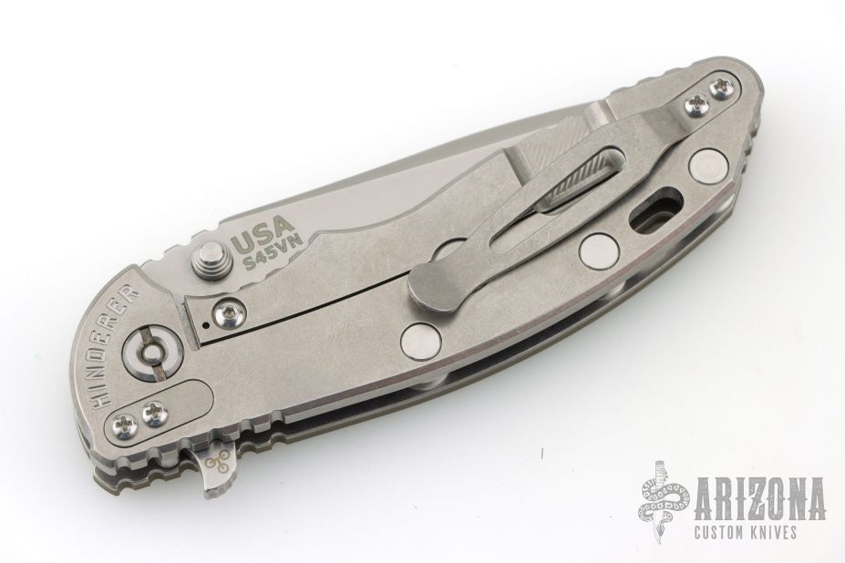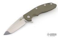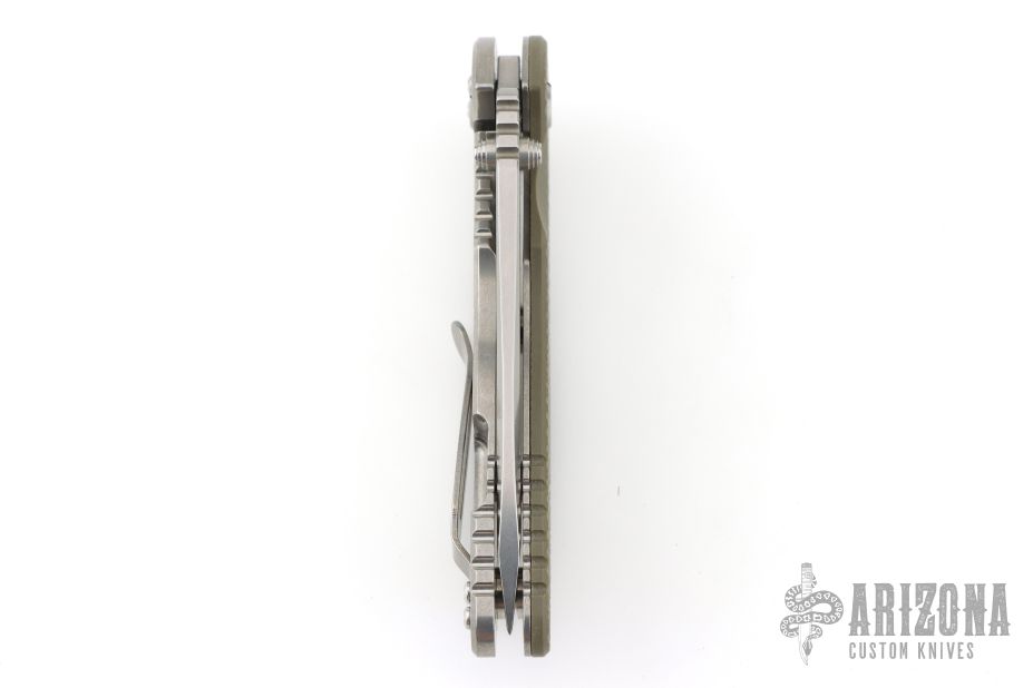 This XM-18 Flipper by Rick Hinderer Knives features a 3.5" stonewash finished blade, notched thumbrest and flipper, dual thumbstuds. The handle has an OD green G-10 scale, and a stonewash finish titanium handle and satin finished hardware, and matching titanium clip. Clip can be mounted for tip up or down carry. Nice lockup, seating, and detent. Excellent condition.