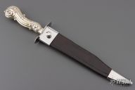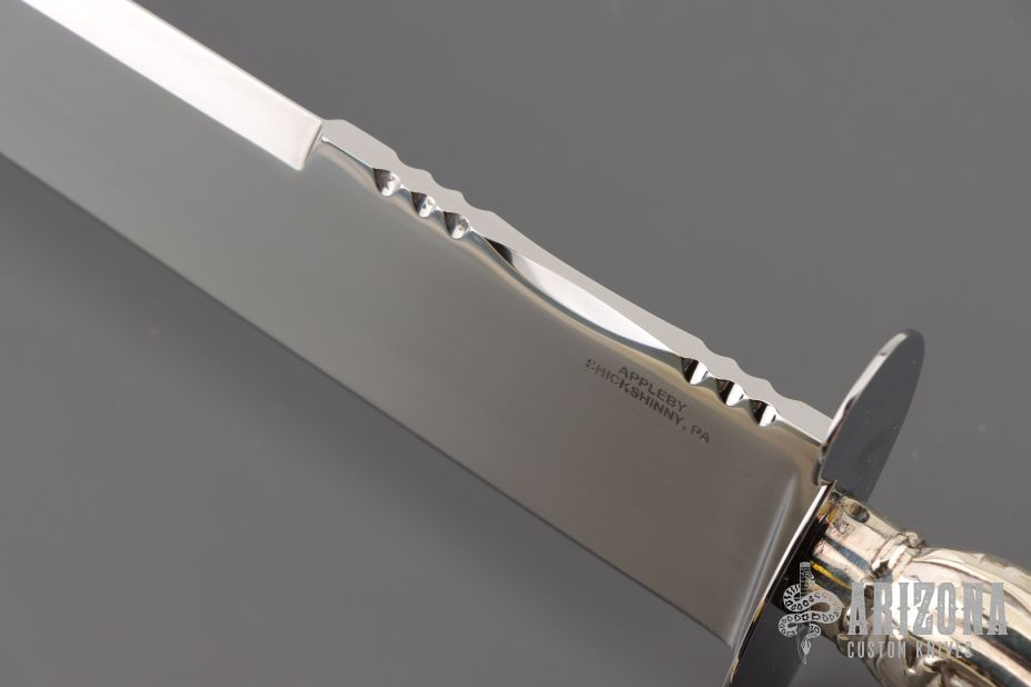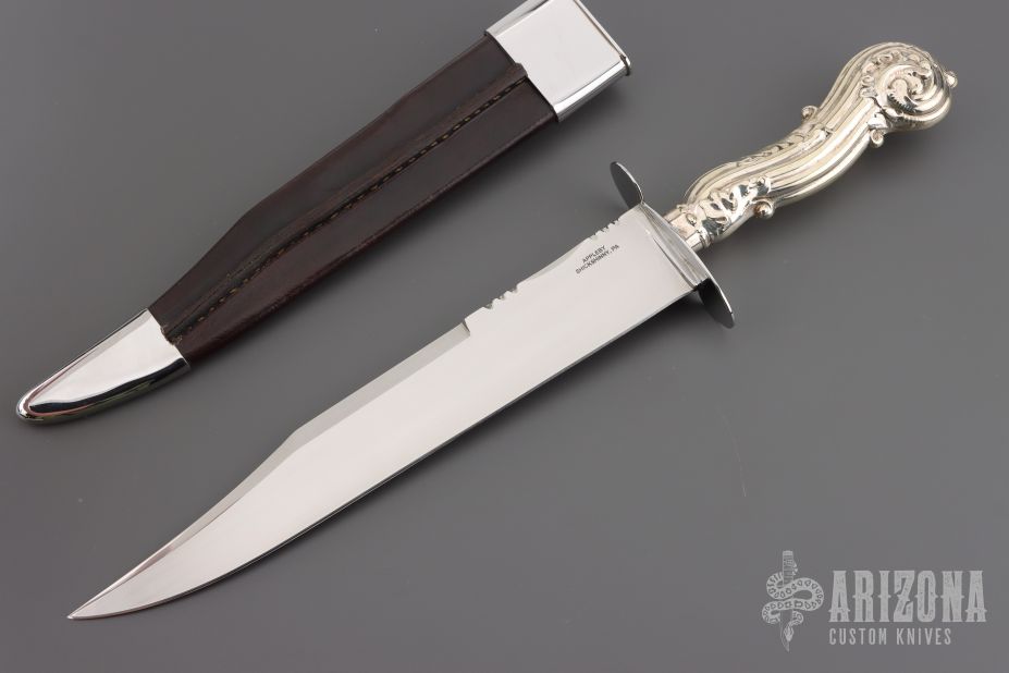 This Bowie by Robert Applyby features a hand rub satin finished blade with a false top edge and fileworked spine, .206" blade stock and 1.533" blade depth, hidden tang construction. The handle has a mirror polished stainless steel guard and an antique silver handle. Comes with a mirror polished stainless steel and black leather sheath. Excellent condition.
