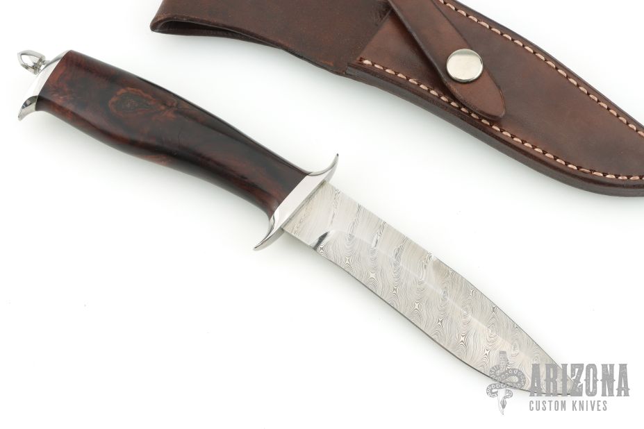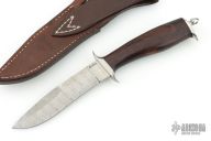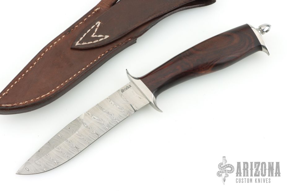 This Chute Knife by Jim Siska features a polished Damascus recurve blade with sharpened top edge, .152" blade thickness and 1.092" blade depth, hidden tang construction. The handle has a mirror polished stainless steel guard and butt cap and a stabilized cocobolo grip. Comes with original brown leather sheath dated '09. Excellent condition. Beautiful knife from a legend.